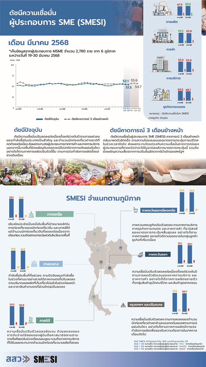 นางสาวปณิตา ชินวัตร รองผู้อำนวยการสำนักงาน รักษาการแทนผู้อำนวยการสำนักงานส่งเสริมวิสาหกิจขนาดกลางและขนาดย่อม เปิดเผยดัชนีความเชื่อมั่นผู้ประกอบการ SME (SMESI) ประจำเดือนมีนาคม 2568 อยู่ที่ระดับ 51.5 ลดลงจากเดือนก่อนหน้าที่ระดับ 52.1 ซึ่งเป็นการลดลงต่อเนื่องนับตั้งแต่ต้นปี 2568 สาเหตุสำคัญมาจากแรงกดดันจากภาวะกำลังซื้อในประเทศที่ชะลอตัว ประกอบกับโครงการเงินดิจิทัล 10,000 บาท (ระยะที่ 2) ที่ยังไม่สามารถกระตุ้นการบริโภคได้ในระยะสั้น นอกจากนี้ภาคการท่องเที่ยวที่เคยเป็นกลไกขับเคลื่อนสำคัญเริ่มมีแนวโน้มชะลอลง โดยเฉพาะจำนวนนักท่องเที่ยวต่างชาติที่ลดลงต่อเนื่อง ส่งผลกระทบโดยตรงต่อผู้ประกอบการภาคการค้าและภาคการบริการ ขณะที่ภาคการเกษตรมีความกังวลต่อทิศทางราคาผลผลิตในตลาดหลายรายการที่ปรับลดลงและในบางพื้นที่ยังได้รับผลกระทบจากภัยธรรมชาติ เช่น เหตุแผ่นดินไหวในเมียนมาที่มีแรงสั่นสะเทือนถึงกรุงเทพมหานคร ยิ่งตอกย้ำความเปราะบางของภาคธุรกิจรายย่อยในระดับภูมิภาค ในทางกลับกันภาคการผลิตมีสัญญาณฟื้นตัว โดยเริ่มเร่งกำลังการผลิตตั้งแต่ต้นเดือนมีนาคม เพื่อเตรียมส่งมอบสินค้าช่วงเทศกาลสงกรานต์ ซึ่งถือเป็นแรงบวกชั่วคราวแต่ยังไม่สามารถเปลี่ยนแนวโน้มของภาพรวมเศรษฐกิจได้ในวงกว้าง