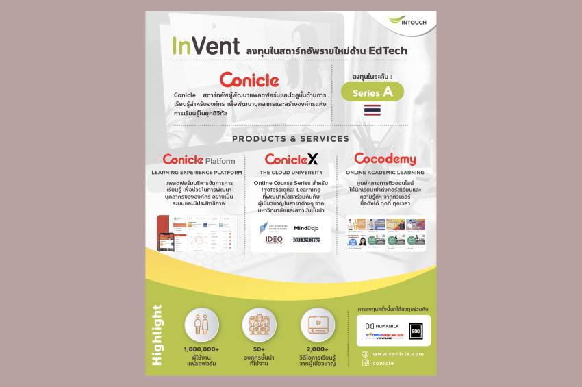 กรุงเทพฯ – 29 มีนาคม 2564 อินเว้นท์ (InVent) โครงการธุรกิจร่วมลงทุนภายใต้บริษัท อินทัช โฮลดิ้งส์ จำกัด (มหาชน) หรือ อินทัช ร่วมกับ Humanica, 500 TukTuks, StormBreaker Venture, และ Stundi ลงทุนใน Conicle บริษัทสตาร์ทอัพด้าน EdTech ผู้พัฒนาแพลตฟอร์มและโซลูชันด้านการเรียนรู้สำหรับองค์กร รอบ Series A มูลค่า 3 ล้านเหรียญสหรัฐฯ (หรือประมาณ 90 ล้านบาท) เพื่อเสริมความแข็งแกร่งและการเติบโตทางธุรกิจ มุ่งสู่การเป็นผู้นำด้าน All-in-One Learning Platform และ HR Transformation Solution ให้กับลูกค้าองค์กร พร้อมขยายตลาดสู่ต่างประเทศ