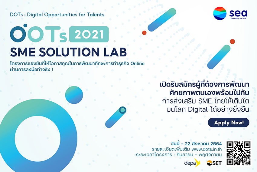 เปิดตัวโครงการ Digital Opportunities for Talents (DOTs) หรือโครงการแข่งขันของคนรุ่นใหม่ที่มุ่งพัฒนาทักษะการเป็นผู้ประกอบการดิจิทัลให้กับผู้เข้าแข่งขัน ทั้งด้านการวางแผนธุรกิจ รวมถึงการลงมือทำจริง พร้อมชิงรางวัลรวมมูลค่ากว่า 200,000 บาท และรับโอกาสพิเศษในการสัมภาษณ์งานกับบริษัทภายในเครือ Sea (ประเทศไทย) โดยโครงการ DOTs ในปี 2564 จัดขึ้นโดยได้รับการสนับสนุนจากพันธมิตรของโครงการ ได้แก่ สำนักงานส่งเสริมเศรษฐกิจดิจิทัล (depa) และตลาดหลักทรัพย์แห่งประเทศไทย (SET) ภายใต้โจทย์ “SME Solution Lab” ไม่เพียงมุ่งพัฒนาทักษะผู้เข้าแข่งขัน แต่ยังเป็นการรวมพลคนรุ่นใหม่เพื่อช่วยต่อยอดธุรกิจให้แก่ร้านค้า SMEs ที่ได้รับคัดเลือกเข้าร่วมโครงการ นับเป็นการนำร่องให้แก่ร้านค้าเหล่านี้ให้สามารถพัฒนาตนเองต่อได้ในระยะยาว โดยโครงการ DOTs ประจำปี 2564 เปิดรับสมัครผู้เข้าแข่งขันแล้วตั้งแต่วันนี้ – 22 สิงหาคม 2564