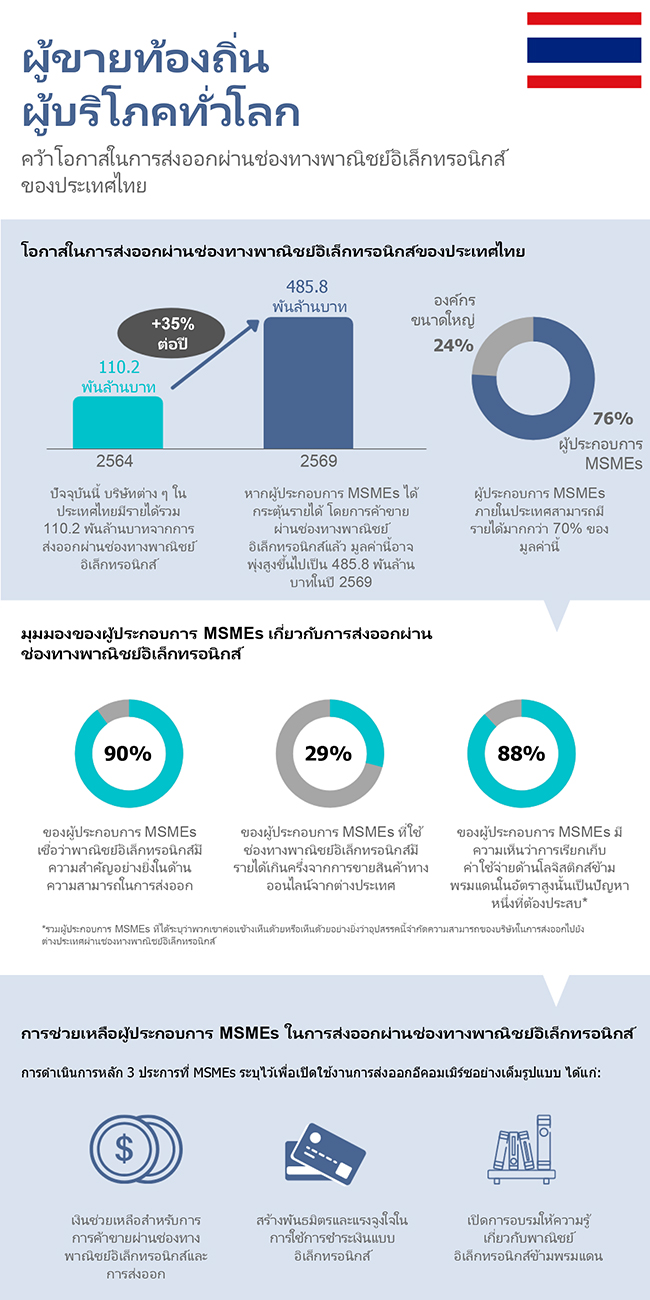 และสามารถขึ้นแตะถึงระดับ 4.858 แสนล้านบาทในปี 2569 หากผู้ประกอบการวิสาหกิจขนาดกลาง ขนาดย่อม และรายย่อย (Micro, Small and Medium-sized Enterprises: MSMEs) สามารถปรับตัวให้เท่าทันตลาดอีคอมเมิร์ซต่างประเทศ คือส่วนหนึ่งของผลวิจัยที่จัดทำขึ้นโดยได้รับมอบหมายจากอเมซอน (Amazon) เรื่อง “ผู้ขายสินค้าจากประเทศไทย และผู้บริโภคทั่วโลก: โอกาสเติบโตของธุรกิจไทยไปสู่ตลาดโลกด้วยการค้าออนไลน์ระหว่างประเทศ” (Local Sellers, Global Consumers: Capturing Thailand’s e-commerce export opportunity) ที่เพิ่งได้รับการเผยแพร่ในงาน เสวนา ของอเมซอนกลางเดือนพฤศจิกายน 2564
