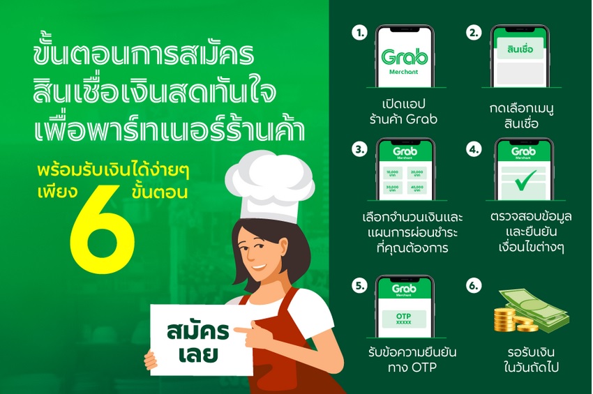 - สมัครง่าย: ผู้ประกอบการร้านอาหารซึ่งเป็นพาร์ทเนอร์ของแกร็บสามารถเข้าถึงแหล่งเงินทุนได้ผ่านแอปพลิเคชันร้านค้าของแกร็บ (Grab Merchant App) โดยไม่ต้องมีหลักทรัพย์ค้ำประกัน หรือยื่นเอกสารในการสมัครเพิ่มเติม เพียงแค่มียอดขายอาหาารผ่านแกร็บฟู้ดขั้นต่ำ 5,000 บาทต่อเดือน และมีธุรกรรมกับแกร็บมาแล้วอย่างน้อย 3 เดือนย้อนหลังติดต่อกัน