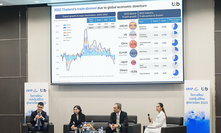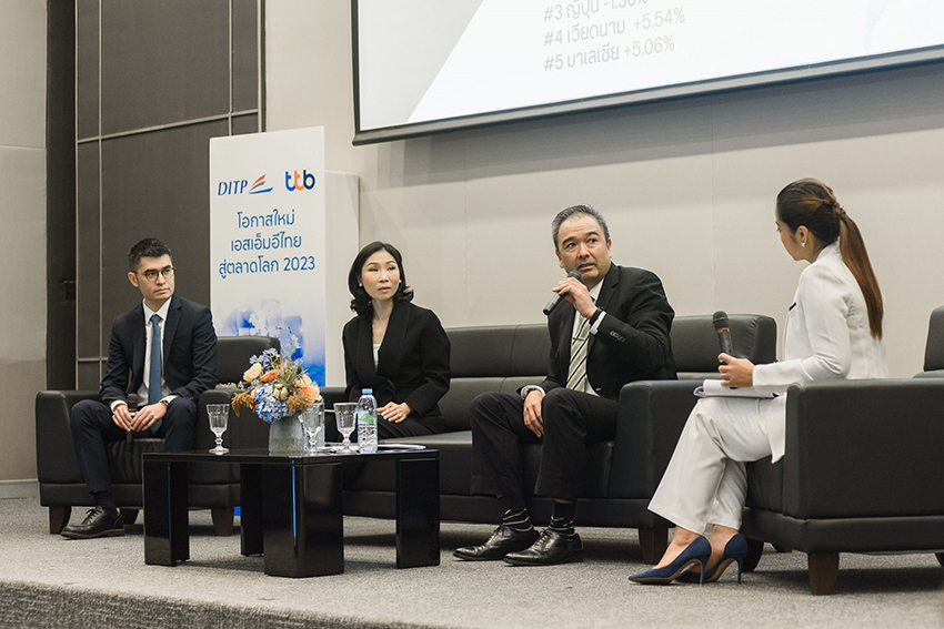 นางสาวสุกัญญา ตรีเสน่ห์จิต รองประธานเจ้าหน้าที่บริหาร หัวหน้าบริหารความสัมพันธ์ลูกค้าเอสเอ็มอี ทีเอ็มบีธนชาต หรือ ทีทีบี กล่าวว่า ธนาคารพร้อมช่วยเหลือผู้ประกอบการเอสเอ็มอีส่งออก-นำเข้าของไทย ซึ่งมักประสบปัญหาการเข้าถึงแหล่งความรู้ในการทำการค้าระหว่างประเทศ ที่มีกฎระเบียบมากมาย การจ่ายและรับเงินกับคู่ค้าระหว่างประเทศมีความซับซ้อน อีกทั้งมีความเสี่ยงต้นทุนเพิ่มจากความผันผวนของค่าเงิน เพื่อให้สามารถค้าขายระหว่างประเทศได้ดีขึ้นอย่างมีประสิทธิภาพ โดยร่วมมือกับพันธมิตรอย่างกรมส่งเสริมการค้าระหว่างประเทศ (DITP) ที่ช่วยสนับสนุนและขับเคลื่อนลูกค้าเอสเอ็มอีให้เติบโตพร้อมเดินหน้าสู่การทำตลาดต่างประเทศ ผ่านการจัดงานเสวนา “โอกาสใหม่เอสเอ็มอีไทยสู่ตลาดโลก 2023” ที่ถ่ายทอดองค์ความรู้ที่เจาะลึกถึงแนวโน้มเศรษฐกิจโลก สถานการณ์การส่งออก โอกาสและตลาดใหม่สำหรับเอสเอ็มอี พร้อมด้วยแนวทางบริหารความเสี่ยง และนโยบายส่งเสริมผู้ประกอบการจากภาครัฐ จากผู้บริหารที่มากประสบการณ์ ทั้งจากทางธนาคารและ DITP
