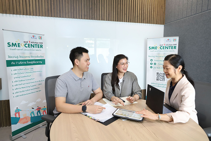 นายยุทธศักดิ์ ภูมิสุรกุล ประธานเจ้าหน้าที่บริหาร บริษัท ซีพี ออลล์ จำกัด (มหาชน) ผู้บริหารเซเว่น อีเลฟเว่น และเซเว่น เดลิเวอรี่ กล่าวว่า “ศูนย์ 7-Eleven สนับสนุน SME” จัดตั้งขึ้นภายใต้แนวคิด “SME โตไกลไปด้วยกัน” เพื่อตอกย้ำกลยุทธ์ 3 ให้ ประกอบด้วย 1.ให้ช่องทางขาย 2.ให้ความรู้ และ 3.ให้การเชื่อมโยงเครือข่าย โดยให้การสนับสนุน ส่งเสริม และอำนวยความสะดวกให้กับกลุ่มธุรกิจ SME ในการเข้าถึงแหล่งข้อมูล ความรู้ งานวิจัย ตลอดจนเป็นสื่อกลางในการเชื่อมโยงเครือข่ายพันธมิตรทั้งภาครัฐและเอกชนให้กับ SME ผ่าน 7 บริการ SME Service Solution ที่ตอบโจทย์ทุกความต้องการของ SME