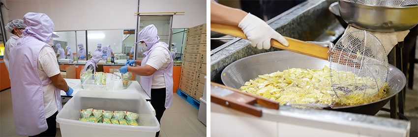 ความพิเศษที่ทำให้สินค้าภายใต้แบรนด์ “วี ฟาร์ม ตะกร้า” มีความโดดเด่นต่างจากผลิตภัณฑ์อื่นในตลาด คือ ทางกลุ่มฯใช้กล้วยหอมทองพันธุ์ไทยแท้ ซึ่งมีคุณลักษณะเฉพาะคือ เนื้อเนียน ละเอียด แน่น รสชาติอร่อย โดยเก็บเกี่ยวในระยะกล้วยดิบที่แก่ 80% นำมาผ่านกระบวนการทำความสะอาด และนำไปสไลด์ด้วยใบมีดพิเศษที่ทำให้ชิ้นกล้วยมีความบาง เมื่อนำไปทอดจะทำให้ได้ชิ้นกล้วยที่กรอบเสมอกันทุกชิ้น และมีสีเหลืองสวยงาม และนำมาอบเนยให้ความหอม จนได้เป็น “กล้วยหอมอบเนย” ขณะที่กล้วยดิบที่แก่มากกว่า 80% แต่ไม่เกิน 95% จะนำมาแปรรูปเป็นกล้วยหอมกรอบ เพื่อลดการสูญเสียของกล้วยหอมทองที่นำมาแปรรูปไม่ทัน