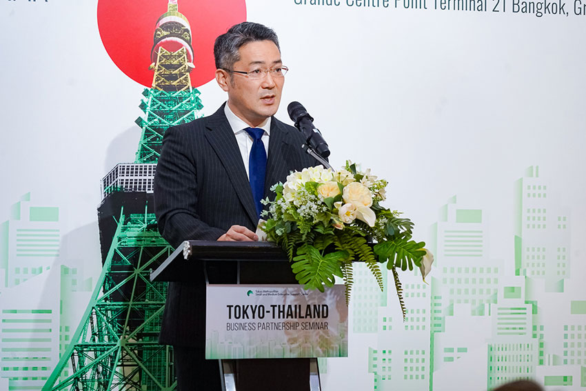 นายมาซาทากะ อาซาคุระ (Mr. Masataka Asakura) Manager, Professional Career Development Support Section, Global Support Team ศูนย์สนับสนุนวิสาหกิจขนาดกลางและขนาดย่อม เมืองโตเกียว ประเทศญี่ปุ่น กล่าวว่า“Tokyo Metropolitan Small and Medium Enterprise Support Center หรือ ศูนย์สนับสนุนวิสาหกิจขนาดกลางและขนาดย่อมกรุงโตเกียว มีหน้าที่ส่งเสริมและสนับสนุนภาคอุตสาหกรรมในธุรกิจขนาดเล็กและขนาดกลางในกรุงโตเกียวมานานกว่า 50 ปี ซึ่งเปิดให้บริการในหลากหลายรูปแบบ ตั้งแต่การก่อตั้งธุรกิจ การเริ่มต้นธุรกิจ การขยายธุรกิจไปยังต่างประเทศ การสืบทอดและการฟื้นฟูธุรกิจในทุกขั้นตอน ตลอดจนให้การสนับสนุนแก่บริษัทต่างชาติที่ต้องการขยายธุรกิจมายังกรุงโตเกียวมาตั้งแต่ปี 2019 ส่วนในประเทศไทยได้ทำการเปิดสำนักงานเมื่อปี 2015 เพื่อเชื่อมโยงนักลงทุนไทย-ญี่ปุ่นเข้าด้วยกันอย่างลงตัว รวมถึงสนับสนุนให้เกิดการลงทุนและการส่งออกสินค้าของนักลงทุนชาวไทยในกรุงโตเกียวมากขึ้น ซึ่งเห็นได้จากการส่งออกของสินค้าไทยไปที่ประเทศญี่ปุ่นที่มีกว่า 10% ในทางกลับกันประเทศญี่ปุ่นเป็นปลายทางการท่องเที่ยวอันดับต้นๆ ของคนไทยเช่นกัน