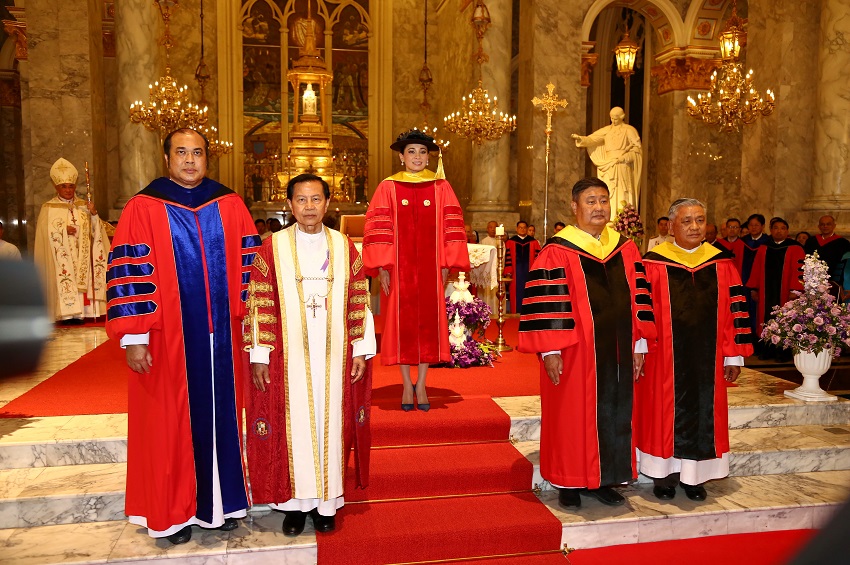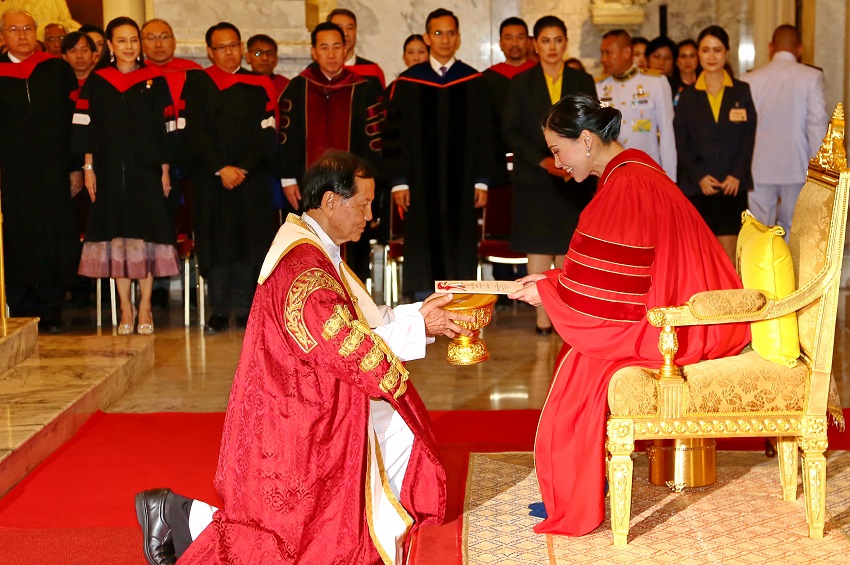 ภราดา เดชาชัย ศรีพิจารณ์ นายกสภามหาวิทยาลัยอัสสัมชัญ ทูลเกล้าฯ ถวายคำประกาศราชสดุดีพระเกียรติคุณ ภราดา ศิริชัย ฟอนซีกา กรรมการสภามหาวิทยาลัยอัสสัมชัญ ทูลเกล้าฯ ถวายพระมาลาดุษฎีบัณฑิต และผ้าประดับพระอังษา