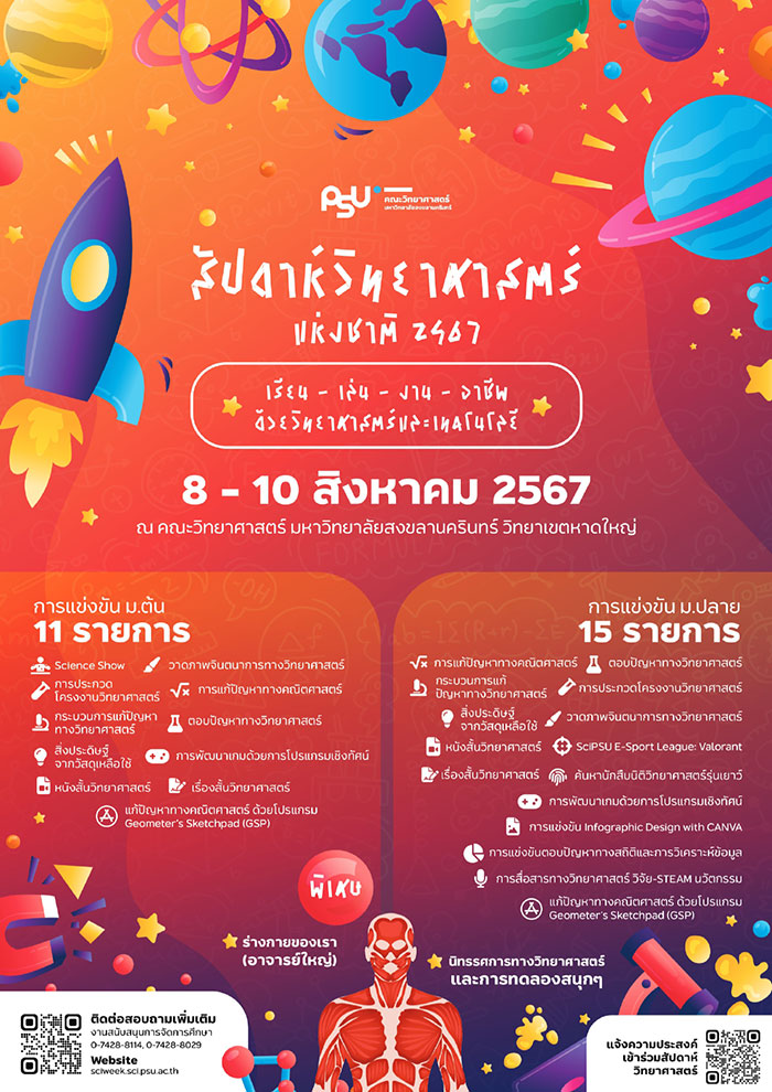 มหาวิทยาลัยสงขลานครินทร์ โดย คณะวิทยาศาสตร์ เตรียมเปิดบ้านจัดกิจกรรม “สัปดาห์วิทยาศาสตร์แห่งชาติ ประจำปี 2567” จัดเต็มกิจกรรมการเรียนรู้วิทยาศาสตร์ การแข่งขันทางวิทยาศาสตร์ และนิทรรศการให้ความรู้ทางด้านวิทยาศาสตร์จากหน่วยงานภายนอกมาร่วมจัดแสดงกว่า 10 หน่วยงาน รวมถึงกิจกรรมการเรียนรู้ร่างกายมนุษย์ผ่านร่างอาจารย์ใหญ่ และกิจกรรมการแข่งขันทางวิทยาศาสตร์ โดยในปีจัดขึ้นระหว่างวันที่ 8-10 สิงหาคม 2567 ณ คณะวิทยาศาสตร์ มหาวิทยาลัยสงขลานครินทร์ วิทยาเขตหาดใหญ่