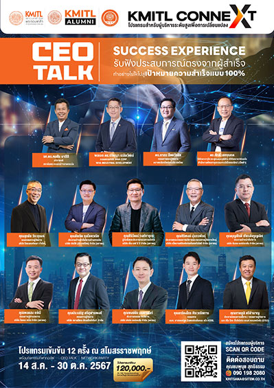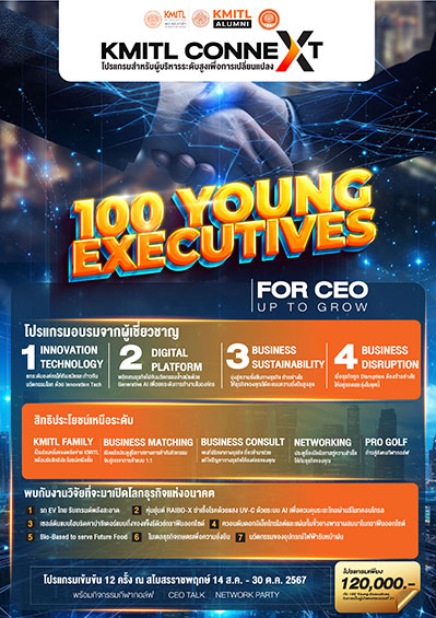 โดยในวันที่ 14 สิงหาคม 2567 จะจัดให้มีการปฐมนิเทศเสวนา Panel Discussion หัวข้อ ผู้บริหารรุ่นใหม่กับการเปลี่ยนแปลงของโลกธุรกิจ ส่วนโปรแกรมการอบรม ตั้งแต่วันที่ 21 สิงหาคม – 30 ตุลาคม 2567 หรือทุกวันพุธ (จำนวน 12 ครั้ง) ณ สโมสรราชพฤกษ์ ถ.วิภาวดีรังสิต รับจำนวนจำกัด ผู้ที่สนใจสามารถดูรายละเอียดเพิ่มเติมได้ที่ This email address is being protected from spambots. You need JavaScript enabled to view it. หรือ Line: @KMITLCONNEXT หรือ Website: www.kmitlconnext.com หรือ Facebook Fanpage: KMITLCONNEXT หรือติดต่อโทร. 090 198 2080