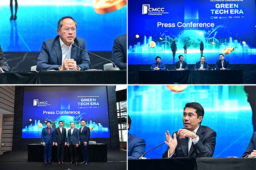 นายสมศักดิ์ ศิริชัยนฤมิตร (ที่2 จากขวา) ประธานคณะกรรมการการแข่งขัน CMCC 2024 และประธานกรรมการชมรมวาณิชธนกิจ สมาชิกบริษัทหลักทรัพย์ไทย (IB Club) ร่วมกับ นายพรพุทธ ริจิรวนิช (ขวา) ผู้อำนวยการการแข่งขัน CMCC 2024 และในฐานะประธานเจ้าหน้าที่บริหาร กลุ่มบริษัทที่ปรึกษาทางการเงินและการลงทุน FynnCorp ได้รับเกียรติจาก นายจักรชัย บุญยะวัตร (ที่2 จากซ้าย) ผู้จัดการ กองทุนส่งเสริมการพัฒนาตลาดทุน (CMDF) ในฐานะผู้สนับสนุนโครงการ พร้อมด้วย นายนรัญจ์ พุ่มศิริ (ซ้าย) ประธานเจ้าหน้าที่การเงิน กลุ่ม บริษัท เดอะ วัน เอ็นเตอร์ไพรส์ จำกัด (มหาชน) หรือ ONEE ในฐานะ Case Company ร่วมงานแถลงข่าว เปิดฉากสุดยอดเวทีการแข่งขันเคสตลาดทุนแห่งปี โครงการ Capital Market Case Competition 2024 (CMCC) ภายใต้คอนเซ็ปต์ “The Alternative Fundraising for the Green Tech Era” จัดขึ้นต่อเนื่องเป็นปีที่ 2