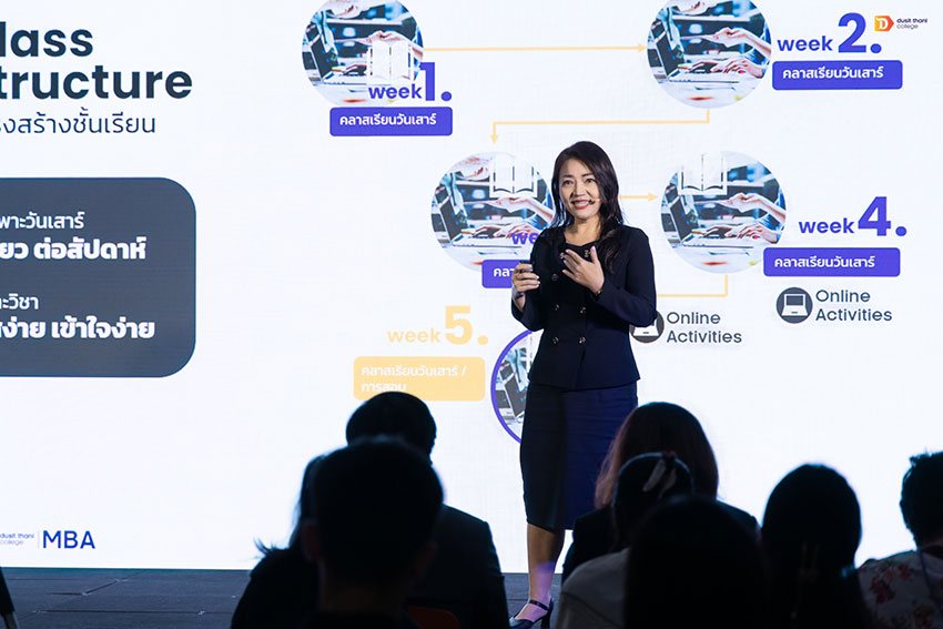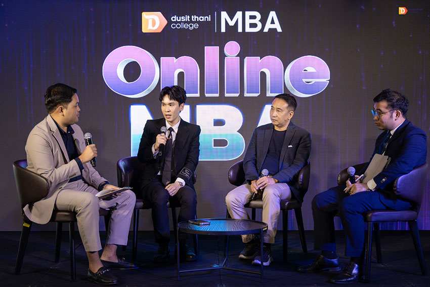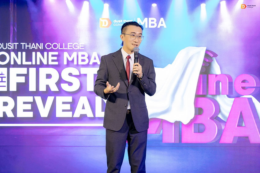 ภายในงาน ดร. อรรถเวทย์ พฤกษ์สถาพร อธิการบดีวิทยาลัยดุสิตธานี ได้ขึ้นกล่าวเปิดงานด้วยวิสัยทัศน์ที่ชัดเจนว่า “การเรียนรู้ไม่ได้จำกัดอยู่แค่ในห้องเรียนหรือห้องสมุดอีกต่อไป แต่เกิดขึ้นจากการลงมือทำจริง วิทยาลัยดุสิตธานีจึงพัฒนาหลักสูตร MBA Online ที่เรียนได้ 100% ทางออนไลน์ โดยจะอยู่ที่ไหนในโลกก็เรียนได้ ขอเพียงมีอินเทอร์เน็ต”
