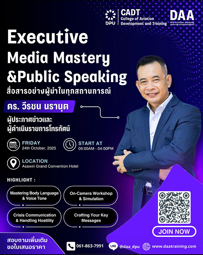 วิทยาลัยการพัฒนาและฝึกอบรมด้านการบิน (CADT) มหาวิทยาลัยธุรกิจบัณฑิตย์ (DPU) เปิดอบรมหลักสูตรระยะสั้น "Executive Media Mastery & Public Speaking" เป็นครั้งแรก เป้าหมายมุ่งติดอาวุธการสื่อสารที่ทรงพลังผู้บริหารระดับกลางและระดับสูงในองค์กรโลกธุรกิจ เพิ่มทักษะขั้นสูงรับมือความท้าทายในภาวะวิกฤต พลิกจากปัญหาสู่โอกาสของการตอกย้ำภาพลักษณ์องค์กรอย่างมืออาชีพ โดยจัดขึ้นในวันที่ 24 ตุลาคมนี้ เวลา 09.00 – 16.00 น. ณ โรงแรมอัศวิน แกรนด์ คอนเวนชั่น กรุงเทพฯ