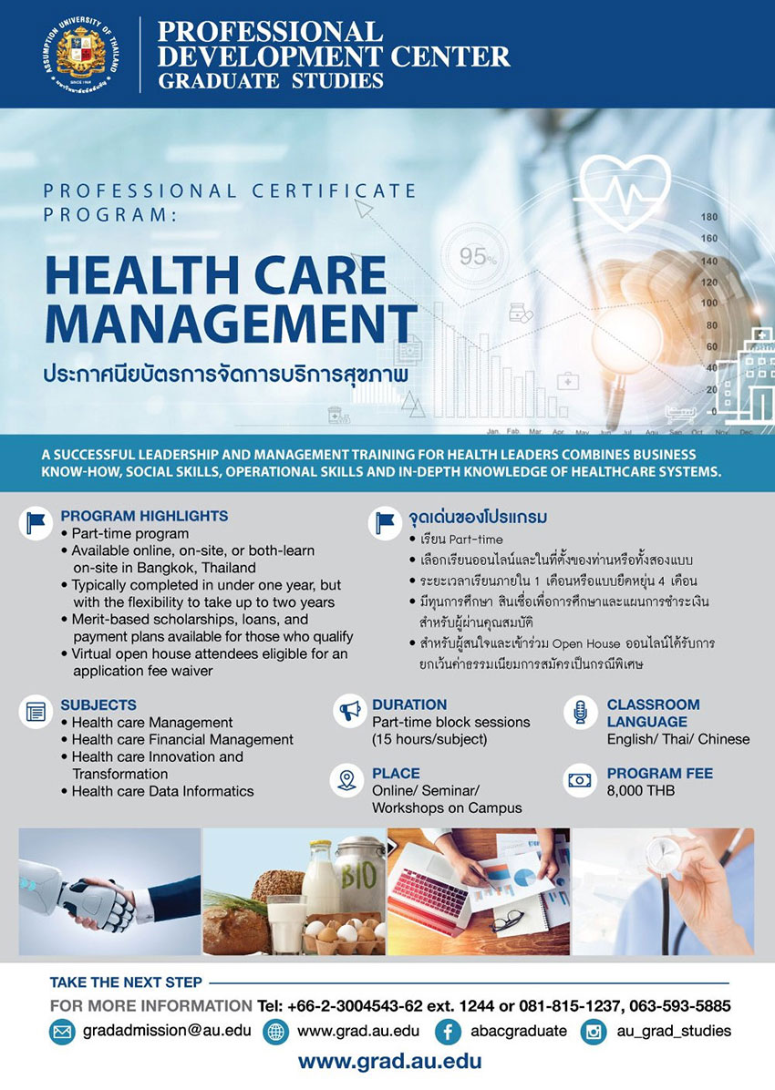 เพราะเล็งเห็นและตระหนักได้ถึงความต้องการที่จะต้องช่วยยกระดับองค์ความรู้ พัฒนา และส่งเสริมให้ภาคธุรกิจด้านบริการสุขภาพของไทยมีความก้าวหน้า และสามารถรองรับกับสภาพแวดล้อมและความต้องการของอุตสาหกรรมในด้านสุขภาพที่กำลังเป็นที่ขยายตัวทั้งภายในและต่างประเทศทั่วโลก ทางบัณฑิตวิทยาลัย คณะบริหารธุรกิจ มหาวิทยาลัยอัสสัมชัญ (เอแบค) ได้เปิดตัวประกาศนียบัตรการจัดการธุรกิจบริการสุขภาพ (Professional Certificate in Health Care Business Management) โดยแถลงผ่านในงาน AU Open House 2020 เมื่อต้นเดือนสิงหาคม 2563 ที่ผ่านมา ที่ ABAC Professional Training Center ณ ชั้น 14 อาคารเซน เวิลด์ ทาวเวอร์ โดยมีคณะผู้บริหารของสาขาบริหารธุรกิจ ของเอแบคได้ร่วมแถลงถึงแนวนโยบายและความสำคัญของหลักสูตรต่างๆ โดยมี ดร.ภัครา เรืองสิรเดโช ผู้อำนวยการหลักสูตรประกาศนียบัตร ด้านการบริหารการจัดการด้านสุขภาพ ได้ร่วมกล่าวถึงเป้าหมายของหลักสูตรที่ต้องการมุ่งส่งเสริมให้ผู้บริหารและผู้ประกอบการในธุรกิจและอุตสาหกรรมด้านสุขภาพพบความสำเร็จอย่างก้าวไกลไปสู่ระดับสากล โดยเฉพาะอย่างยิ่งในสถานการณ์โลกที่เปลี่ยนไป