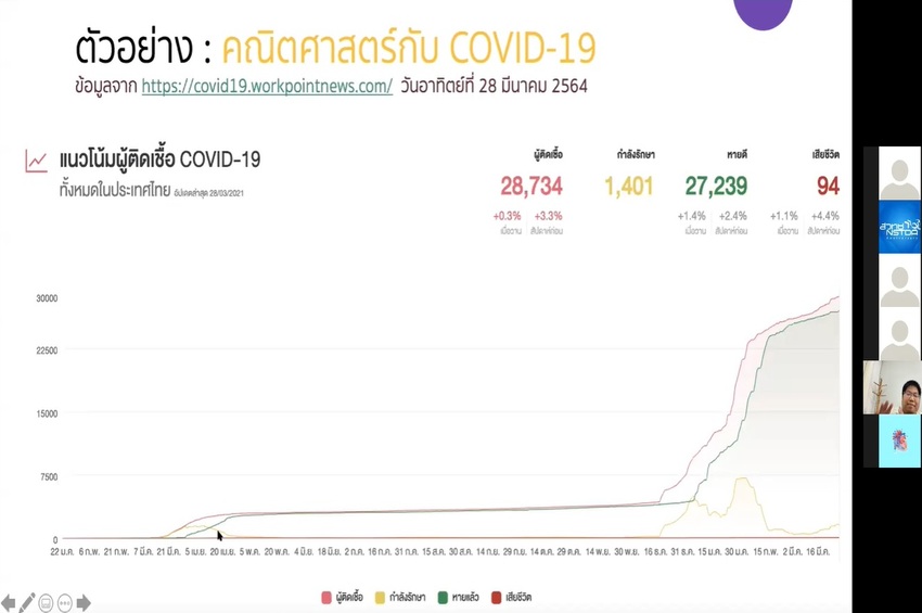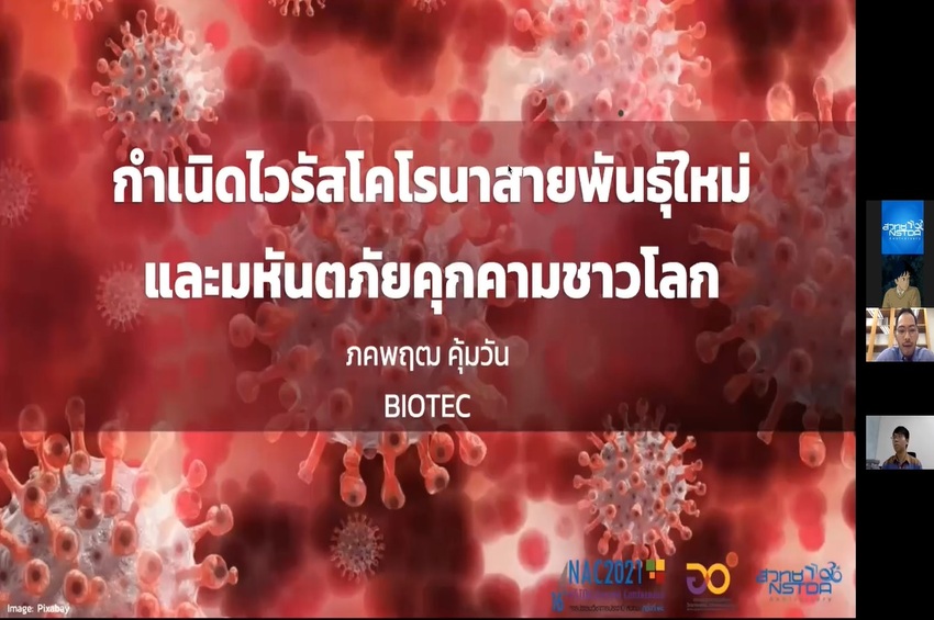 เริ่มจากความรู้ใกล้ตัวที่สุดของมวลมนุษยชาติในตอนนี้ คือสถานการณ์การระบาดของโรคโควิด-19 ซึ่งเป็นโรคอุบัติใหม่ที่เพิ่งเกิดขึ้นปีเศษๆ ทั่วทั้งโลกให้ความสนใจศึกษาและป้องกันตัวเองจากโรคดังกล่าว ซึ่งนักวิจัยและวิชาการของไทยก็มีความรู้เรื่องนี้ไม่แพ้ชาติอื่นๆ เช่นกัน โดยความรู้ในเรื่องโควิด-19 ครั้งนี้ น้องเยาวชนให้ความสนใจและได้รับจาก ดร.ภคพฤฒ คุ้มวัน หรือ พี่เป้ นักวิจัยจากศูนย์ไบโอเทค สวทช. มาเล่าให้ฟังเกี่ยวกับโควิด 19 โดยทำความเข้าใจง่ายๆ ทำให้รู้การดำรงของไวรัสโคโรนา ที่เปรียบเทียบง่ายๆ กับการทำอาหารพวกพิซซ่าว่าจะเลือกเมนูหน้าอะไร ก็เหมือนกับที่ไวรัสจะมีสารพันธุกรรมอาร์เอ็นเอคอยสั่งการว่าให้สร้างโปรตีนแบบใด และกลไกไวรัสตัวร้ายไปทำลายปอดเสียหาย ทั้งนี้การเรียนรู้จากสถานการณ์ดังกล่าวควรนำไปสู่การปฏิบัติจริงที่เป็นประโยชน์ไม่ว่าจะเป็น การเฝ้าระวัง การป้องกันตนเองและสังคมไม่ให้ติดโรค