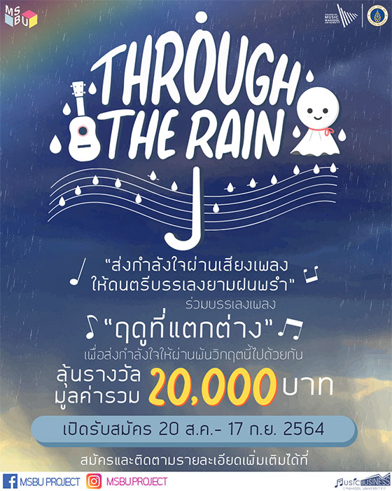 ผู้ที่สนใจเข้าร่วมกิจกรรม Through the rain เพียงอัดคลิปการแสดงดนตรีของคุณในเพลง “ฤดูที่ แตกต่าง” ความยาวไม่เกิน 2 นาที ส่งคลิปวิดีโอผ่านทางใบสมัครออนไลน์ที่ Facebook Page : MSBU Project และสำหรับคลิปวิดีโอที่ผ่านการคัดเลือกจากทางกรรมการ รับรางวัลมูลค่า 1,000 บาท จำนวน 20 รางวัล เปิดรับ สมัครตั้งแต่วันที่ 20 สิงหาคม – 17 กันยายน 2564 นี้