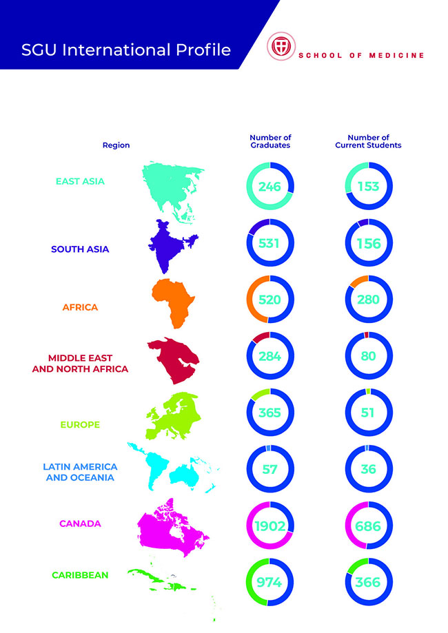 โดยภาพรวม SGU ได้ให้การสนับสนุนแพทย์มาแล้วกว่า 19,000 คน ให้เป็นบุคลากรแพทย์ระดับโลก ประกอบไปด้วยนักศึกษา บัณฑิต และคณาจารย์จากกว่า 150 ประเทศ รวมถึงประเทศไทย ผู้สำเร็จการศึกษา หรือ บัณฑิตจาก SGU ได้เข้าฝึกฝนทางวิชาชีพอยู่ในทุกมลรัฐของสหรัฐอเมริกา และในอีกมากกว่า 50 ประเทศ