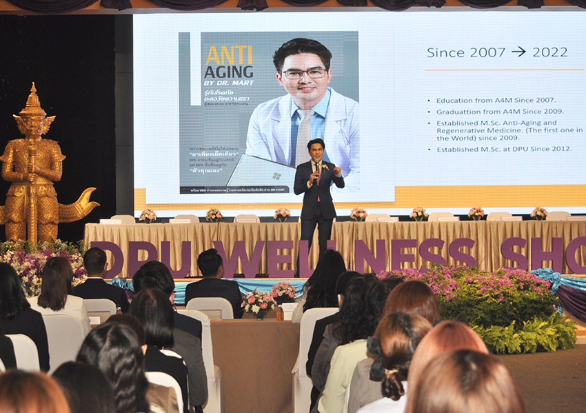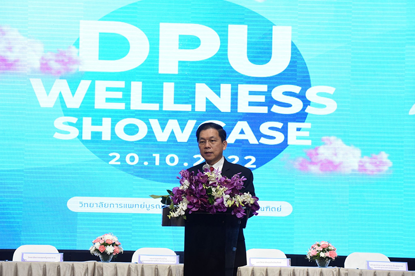 ดร.ดาริกา ลัทธพิพัฒน์ อธิการบดีมหาวิทยาลัยธุรกิจบัณฑิตย์ ให้เกียรติเป็นประธาน พร้อมกล่าวเปิดงาน ว่า “การจัดกิจกรรม DPU Wellness Showcase และการเปิดศูนย์ DPU Wellness Center นอกจากจะเป็นการเฉลิมฉลองครบรอบ 55 ปี ในเดือนพฤษภาคม 2566 แล้ว ยังเป็นการฉลองครบรอบ 11 ปี ของหลักสูตรเวชศาสตร์ชะลอวัยและฟื้นฟูสุขภาพ ซึ่ง Wellness เป็นหนึ่งในแนวทางขับเคลื่อนด้านการศึกษาของ DPU และเป็นหัวใจสำคัญของการพัฒนาประเทศด้วย โดยประเทศไทยและทั่วโลกได้ให้ความสำคัญกับการขับเคลื่อนเศรษฐกิจ 3 ส่วน คือ Digital Economy, Green Economy และ Care Economy ซึ่ง DPU มีความพร้อมทั้งด้านแพทย์ผู้เชี่ยวชาญในการพัฒนาผลิตบุคลากรที่ตอบโจทย์อุตสาหกรรม Wellness และ DPU ยังมีหน้าที่หลัก คือ การผลิตและพัฒนาคนให้สอดรับกับความต้องการของภาคอุตสาหกรรม และกำลังคนของประเทศ ซึ่งไทยยังขาดแคลนบุคลากรด้าน Wellness รวมทั้งงานวิจัยด้านนี้มีจำนวนจำกัด การเปิดศูนย์ DPU Wellness Center จึงจะเป็นแหล่งฝึกปฏิบัติการสำหรับนักศึกษา รวมถึงเป็นแหล่งศึกษาวิจัยร่วมกับเครือข่ายต่าง ๆ ทั้งภาครัฐและเอกชน”