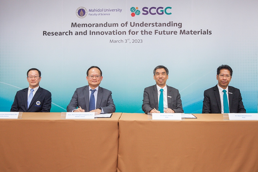 คณะวิทยาศาสตร์ มหาวิทยาลัยมหิดล ร่วมกับบริษัท เอสซีจี เคมิคอลส์ จำกัด (มหาชน) หรือ SCGC ธุรกิจเคมีภัณฑ์เพื่อความยั่งยืน ผนึกกำลังจัดงาน SCGC-Mahidol Science Symposium: “Healthcare, Well-being & Sustainability” เดินหน้าความร่วมมือสร้างสรรค์งานวิจัยเชิงพาณิชย์ ผลักดันนวัตกรรมเพื่อสุขภาพ ความเป็นอยู่ที่ดี และความยั่งยืนให้กับผู้คนทั้งในประเทศไทยและระดับสากล ตอบรับเมกะเทรนด์ ภายในงานได้มีการลงนามบันทึกความร่วมมือ Research and Innovation for the Future Materials โดยรองศาสตราจารย์ ดร.พลังพล คงเสรี คณบดีคณะวิทยาศาสตร์ มหาวิทยาลัยมหิดล และดร.สุรชา อุดมศักดิ์ รองผู้จัดการใหญ่ และประธานเจ้าหน้าที่สายงานนวัตกรรม SCGC ณ ห้องประชุมอาคารสตางค์ มงคลสุข พญาไท คณะวิทยาศาสตร์ มหาวิทยาลัยมหิดล โดยมีทีมผู้บริหารจากคณะวิทยาศาสตร์ มหาวิทยาลัยมหิดล รองศาสตราจารย์ ดร.วีระชัย สิริพันธ์ วราภรณ์ รองคณบดี และ ศาสตราจารย์ ดร.ฤทัยวรรณ โต๊ะทอง รองคณบดีฝ่ายวิจัยและวิเทศสัมพันธ์ และ รองศาสตราจารย์ ดร.ณัฏฐวี เนียมศิริ ผู้ช่วยคณบดี พร้อมทั้งทีมผู้บริหารจาก SCGC นายนิวัฒน์ อธิวัฒนานนท์ ผู้อำนวยการเทคโนโลยี SCGC และ ดร.สุเมธ เจริญชัยเดช หัวหน้าศูนย์วิจัยและพัฒนา SCGC เข้าร่วมงาน