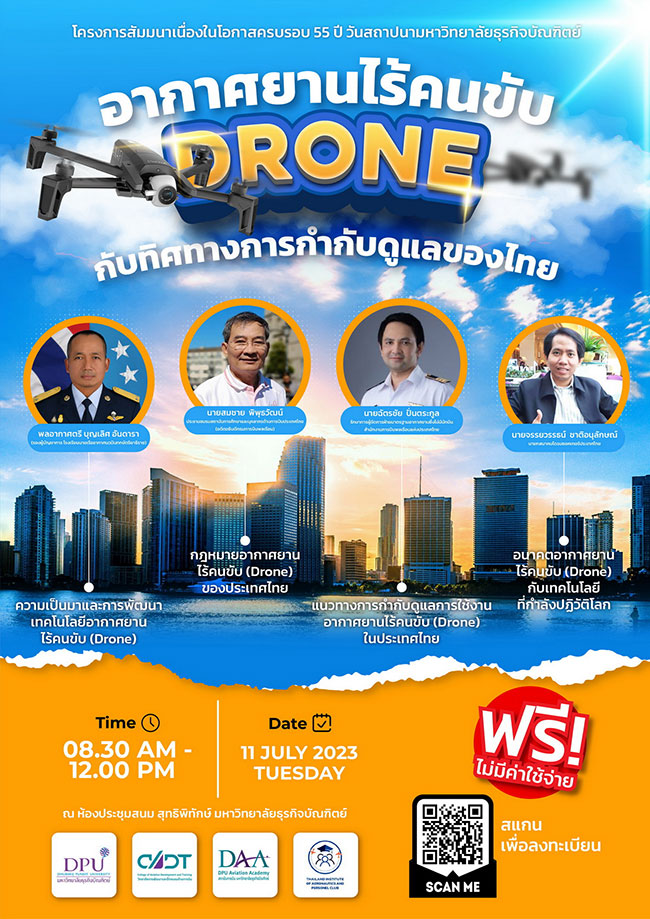 ทั้งนี้ ผู้ใช้โดรนจำเป็นต้องมีความรู้ ไม่ว่าจะเป็นเรื่องของกฎหมายข้อบังคับ หรือระเบียบข้อจำกัดในการใช้ รวมไปถึงเทคโนโลยีใหม่ๆ เป็นต้น ดังกล่าวนี้ วิทยาลัยการพัฒนาและฝึกอบรมด้านการบิน มธบ. (CADT) และชมรมสถาบันการศึกษาและบุคลากรด้านการรบินประเทศไทย (ชสบ.) เล็งเห็นความสำคัญต่อการเติบโตของอุตสาหกรรมโดรน จึงได้ร่วมกันจัดสัมมนา เรื่อง อากาศยานไร้คนขับ (Drone) กับทิศทางการกำกับดูแลของไทย ในวันที่ 11 กรกฎาคม พ.ศ.2566 เวลา 08.30-12.00 น. ณ ห้องประชุมสนม สุทธิพิทักษ์ มหาวิทยาลัยธุรกิจบัณฑิตย์ โดยการจัดงานครั้งนี้มีวัตถุประสงค์เพื่อถายทอดองค์ความรู้ที่เกี่ยวข้องกับ Drone และส่งเสริมความร่วมมือระหว่างมหาวิทยาลัยกับภาครัฐและภาคเอกชน ในการส่งเสริมและสนับสนุนการใช้ประโยชน์จาก Drone และเพื่อฉลองในโอกาสครบรอบ 55 ปี ของการสถาปนามหาวิทยาลัยธุรกิจบัณฑิตย์