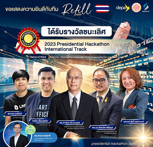 ทีมประเทศไทยได้สร้างผลงานระดับโลก ‘Re-Fill City’ คว้ารางวัลชนะเลิศระดับนานาชาติ ใน ‘การแข่งขันแฮกกาธอน Presidential Hackathon International Track 2023’ จากประธานาธิบดี ไช่ อิงเหวิน ณ ทำเนียบประธานาธิบดี ซึ่งจัดโดยกระทรวงดิจิทัลแห่งไต้หวัน นับเป็นเวทีการแข่งขันด้านเทคโนโลยีและนวัตกรรมดิจิทัลระดับนานาชาติที่ยิ่งใหญ่และทรงเกียรติ งานปีนี้ภายใต้ธีม Free the Future: Open, Digital and Green มุ่งตอบสนองเป้าหมายการพัฒนาอย่างยั่งยืน 2030 (Sustainable Development Goals, SDGs) โดยมีจำนวน 60 ทีมจาก 30 ประเทศทั่วโลกเข้าแข่งขัน ความสำเร็จของทีมไทยสร้างชื่อเสียงและความภาคภูมิใจแก่ประเทศ ตอกย้ำถึงศักยภาพของคนไทยในเวทีโลก สะท้อนพลังความมุ่งมั่นของ สจล. สู่ ‘ผู้นำแห่งนวัตกรรมระดับโลก’ (The World Master of Innovation) เพื่อแก้ปัญหาการพัฒนาของประเทศในพื้นที่ต่างๆ และสนองตอบความต้องการทางสังคม กระตุ้นโอกาสความร่วมมือระหว่างประเทศ ระหว่างวงการ และระหว่างภาคเอกชนและภาครัฐ ให้ผู้เชี่ยวชาญด้านต่างๆ ได้มีโอกาสสื่อสารแลกเปลี่ยนและสร้างประโยชน์แก่ชุมชน คนไทย และมนุษยชาติ ทั้งเติมเต็มคุณค่าของเมืองอัจฉริยะ (Smart City) และการมีส่วนร่วม ซึ่งเป็นแนวโน้มการพัฒนาเมืองที่ยั่งยืนทั่วโลกมากยิ่งขึ้น