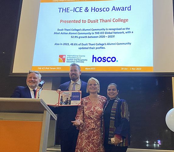 นอกจากนี้วิทยาลัยดุสิตธานียังได้รับรางวัล THE-ICE & HOSCO Award ในฐานะที่เป็นชุมชนศิษย์เก่าซึ่งมีความกระตือรือร้นมากที่สุดในบรรดาเครือข่ายทั่วโลกของ THE-ICE ด้วย