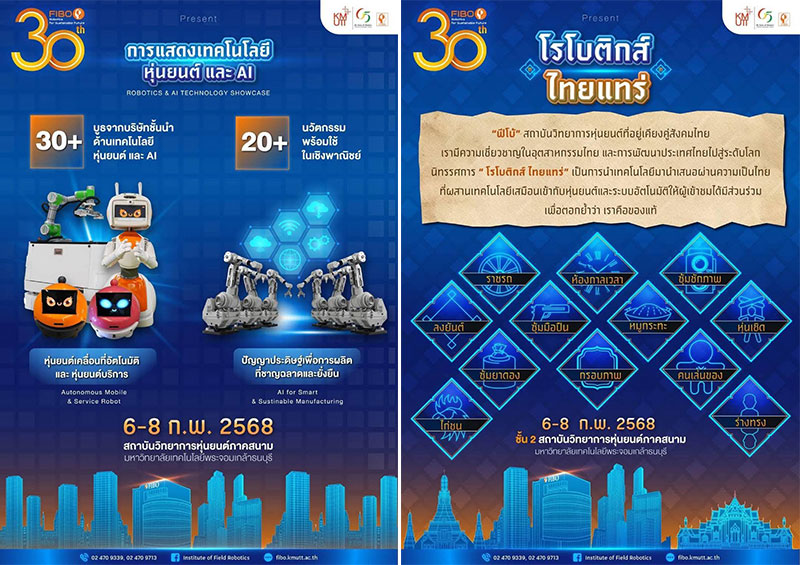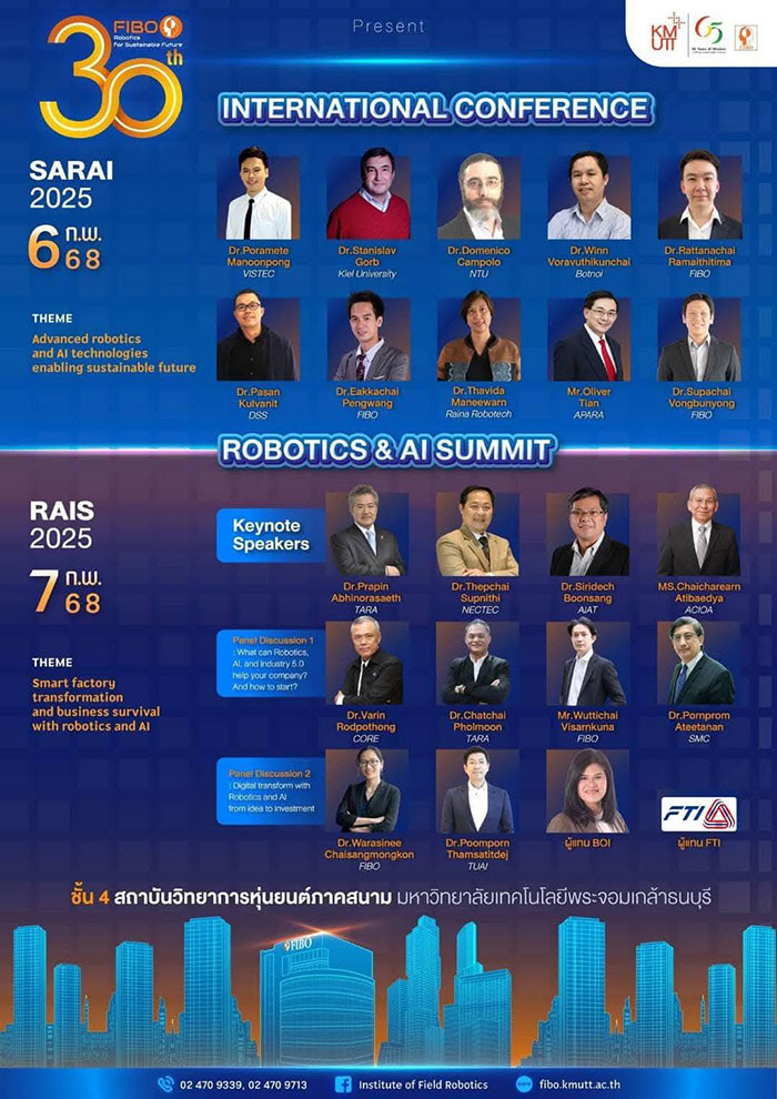 มจธ. ขอเชิญร่วมงาน “30 ปี ฟีโบ้: Robotics for Sustainable Future” ระหว่างวันที่ 6-8 กุมภาพันธ์ 2568 ณ สถาบันวิทยาการหุ่นยนต์ภาคสนาม (ฟีโบ้) มหาวิทยาลัยเทคโนโลยีพระจอมเกล้าธนบุรี พบกับการแสดงศักยภาพด้านวิทยาการหุ่นยนต์ของไทย ผ่านการแสดงหุ่นยนต์และระบบปัญญาประดิษฐ์ นิทรรศการ การประชุมวิชาการ และกิจกรรมสนุกๆ สำหรับเยาวชน ข้อมูลเพิ่มเติม : www.facebook.com/InstituteofFieldRobotics หรือโทร 0-2470-9339
