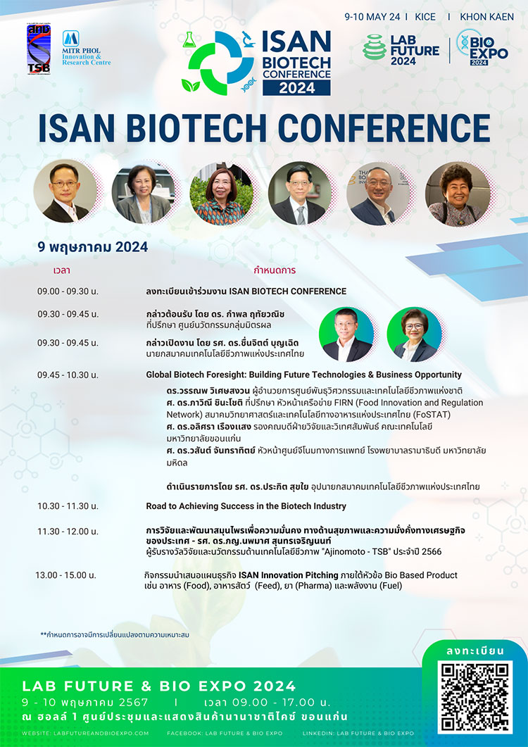 รศ. ดร. ชื่นจิตต์ บุญเฉิด นายกสมาคมเทคโนโลยีชีวภาพแห่งประเทศไทย (TSB) กล่าวว่า “ในการจัดงานครั้งนี้ สมาคมเทคโนโลยีชีวภาพแห่งประเทศไทย (TSB) มีความยินดีที่ได้เป็นผู้สนับสนุนงาน LAB Future & BIO Expo 2024 ด้วยสมาคมฯ มองเห็นความเป็นไปได้ของการยกระดับพื้นที่ในภูมิภาคอีสานสู่ Global Biotech Destination ซึ่งว่าด้วยอุตสาหกรรมด้านวิทยาศาสตร์และเทคโนโลยีชีวภาพนั้น จะเป็นอีกหนึ่งเครื่องมือที่สามารถยกระดับพื้นที่อีสานให้เกิดการไหลเข้ามาด้านเศรษฐกิจและวิจัยพัฒนา รวมถึงการปรับตัวในพื้นที่เพื่อเตรียมความพร้อมสู่การเป็นศูนย์กลางด้านไบโอเทคของประเทศไทยและอาเซียน โดยทางสมาคมฯ มีความยินดีร่วมจัดกิจกรรมสัมมนาไบโอเทคภายใต้หัวข้อ “ISAN Biotech Conference” เพื่อเปิดมุมมองผู้เข้าร่วมงานและผู้สนใจในการลงทุนด้านไบโอเทคในภูมิภาคอีสาน ได้ทำความเข้าใจและเตรียมความพร้อมในการต่อยอดธุรกิจด้านไบโอเทค”