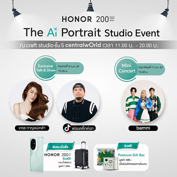 ออเนอร์ (HONOR) ผู้ให้บริการอุปกรณ์อัจฉริยะชั้นนำระดับโลก ส่งมอบความสนุกสุดฟินและขอบคุณผู้บริโภค ด้วยการจัดกิจกรรมพิเศษ “HONOR 200 Series - The Ai Portrait Studio Event” เพื่อเปิดโอกาสให้ทุกคนได้เป็นเจ้าของสมาร์ตโฟน HONOR 200 Series ในราคาที่คุ้มค่าที่สุด และรับของแถมมากมาย* พร้อมพบกับเซอร์ไพรส์พิเศษจากนักแสดงสาวผิวขาวออร่า “เกรซ กาญจน์เกล้า ด้วยเศียรเกล้า” ที่มาร่วมพูดคุยและสร้างสีสันในงาน “พ่อมดติ๊กต๊อก” ที่จะมาแชร์เทคนิกการถ่ายภาพในมุมมองที่น่าสนใจ ในวันที่ 6 กรกฎาคม 2567 เวลา11.00 - 20.00 และมินิคอนเสิร์ตจากศิลปินวง bamm วงทรีโอ้สุดปังแห่งยุคจากค่ายเพลง LIT ENTERTAINMENT ในวันที่ 7 กรกฎาคม 2567 เวลา 11.00 - 20.00 น. โดยกิจกรรมทั้ง 2 วัน จัดขึ้น ณ Craft Studio ชั้น 5 ศูนย์การค้าเซ็นทรัลเวิลด์