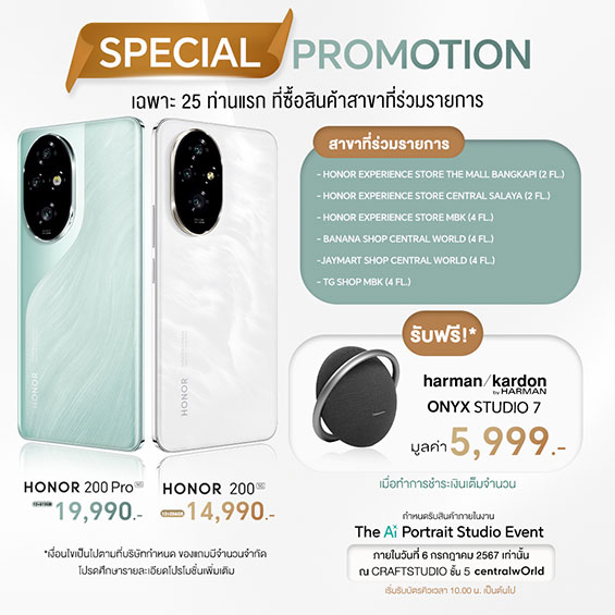 สำหรับกิจกรรม HONOR 200 Series - The Ai Portrait Studio Event เพียงคุณเป็น 25 คนแรกที่จองและชำระเงินเต็มที่ HONOR Experience Store ในแต่ละสาขา ได้แก่ สาขาเดอะมอลล์ ไลฟ์สโตร์ บางกะปิ (ชั้น 2), สาขาเซ็นทรัล ศาลายา (ชั้น 2), สาขาศูนย์การค้าเอ็มบีเค เซ็นเตอร์ (ชั้น 4) และ BaNANA Shop สาขาศูนย์การค้าเซ็นทรัลเวิลด์ (ชั้น 4), Jaymart Shop สาขาศูนย์การค้าเซ็นทรัลเวิลด์ (ชั้น 4) และ TG Shop สาขาศูนย์การค้าเอ็มบีเค เซ็นเตอร์ (ชั้น 4) จะต้องมารับสินค้าที่งาน HONOR 200 Series - The AI Portrait Studio Event เท่านั้น! พร้อมรับโปรโมชันและของแถมพิเศษ ลำโพง Harman Kardon Onyx Studio 7 มูลค่า 5,990 บาท* ในวันเสาร์ที่ 6 กรกฎาคม 2567 (ลงทะเบียนรับสิทธิ์ในช่วงเวลา 10.00 – 10.45 น. เท่านั้น) ณ ศูนย์การค้าเซ็นทรัลเวิลด์