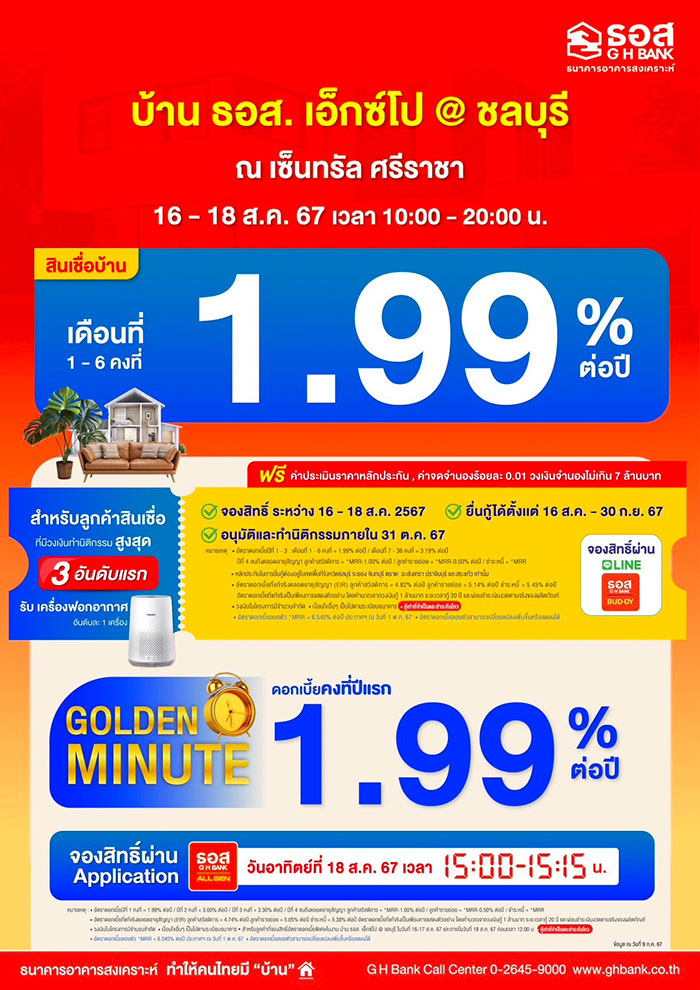 สำหรับโปรโมชั่นพิเศษเพื่อทำให้คนไทยมีบ้าน สินเชื่อบ้านอัตราดอกเบี้ยพิเศษ อัตราดอกเบี้ยปีที่ 1-3 เดือนที่ 1 - 6 คงที่เท่ากับ 1.99% ต่อปี เดือนที่ 7 – 36 คงที่เท่ากับ 3.19% ต่อปี ปีที่ 4 จนถึงตลอดอายุสัญญา ลูกค้าสวัสดิการ *MRR-1.00% ต่อปี ลูกค้ารายย่อย *MRR-0.50% ต่อปี ชำระหนี้ *MRR สำหรับหลักประกันในการยื่นกู้ต้องอยู่ในเขตพื้นที่จังหวัดชลบุรี ระยอง จันทบุรี ตราด ฉะเชิงเทรา ปราจีนบุรี และสระแก้ว เท่านั้น อัตราดอกเบี้ยที่แท้จริงตลอดอายุสัญญา (EIR) ลูกค้าสวัสดิการ 4.82% ต่อปี ลูกค้ารายย่อย 5.14% ต่อปี ชำระหนี้ 5.45% ต่อปี พิเศษ! ฟรีค่าประเมินราคาหลักประกัน ค่าจดจำนองร้อยละ 0.01 และพิเศษแบบสุด ๆ สำหรับลูกค้าภายในงานเท่านั้น!! จะได้พบกับช่วง Golden Minute อัตราดอกเบี้ยปีแรกเพียง 1.99% ต่อปี เปิดจองสิทธิ์ผ่าน Mobile Application : GHB ALL GEN ในวันอาทิตย์ที่ 18 สิงหาคม 2567 ระหว่างเวลา 15.00-15.15 น. จองก่อนได้ก่อน กรอบวงเงินจำกัดและเงื่อนไขตามที่ธนาคารกำหนด พิเศษ! สำหรับลูกค้าที่มีวงเงินทำนิติกรรมสูงสุด 3 อันดับแรก รับเครื่องฟอกอากาศ 1 เครื่อง (อันดับละ 1 เครื่อง) อีกด้วย