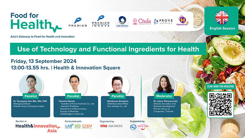 งาน Health and Innovation Asia 2024 และ Food For Health Pavilion ขอเชิญชวนผู้ที่สนใจและบุคคลที่รักสุขภาพเข้าร่วมงานระหว่างวันที่ 11-13 กันยายน 2567 ณ ฮอลล์ 102-104 ไบเทค กรุงเทพฯ ตั้งแต่เวลา 10:00-17:00 น. ลงทะเบียนรับบัตรเข้างานฟรี พร้อมลุ้นรับรางวัลพิเศษมากมายได้ที่ https://eventpassinsight.co/el/to/THLAB0093 หรือเว็บไซต์หลัก https://health-innovation-asia.com สอบถามรายละเอียดเพิ่มเติมได้ทาง 02-1116611 (วีเอ็นยูฯ) หรืออีเมล This email address is being protected from spambots. You need JavaScript enabled to view it. ร่วมเป็นส่วนหนึ่งในก้าวสำคัญสู่การกำหนดอนาคตของการดูแลสุขภาพด้วยเทคโนโลยีที่นี่!
