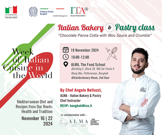 อีกหนึ่งกิจกรรมสร้างสรรค์โดยเฉพาะเพื่อผู้ชื่นชอบของอร่อยจากเบเกอรี่ ด้วยความร่วมมือของ ALMA สถาบันสอนศิลปะการทำอาหารอิตาเลียน จัดกิจกรรมเวิร์คชอปเพื่อเสริมสร้างทักษะในการทำขนมหวานอิตาลี ในวันที่ 19 พฤศจิกายน 2567 ที่ The Food School, Bangkok กับเพสตรี้เชฟอิตาเลียนมากประสบการณ์ แองเจโล่ เบลลูซซี่ (Angelo Belluzzi) ที่จะมาถ่ายทอดเทคนิคการทำ ซิกเนเจอร์ช็อกโกแล็ต พานา ค็อตตา ระหว่างเวลา 10.00 - 12.00 น. เพื่อเปิดโอกาสให้ผู้เข้าร่วมกิจกรรมได้สัมผัสรสชาติขนมอิตาเลียนแท้ๆ และสร้างแรงบันดาลใจให้แก่ผู้มีใจรักการทำอาหาร รีบ ที่นั่งมีจำนวนจำกัด สำรองที่นั่งที่ This email address is being protected from spambots. You need JavaScript enabled to view it.