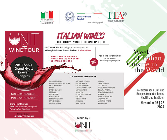 ยังมีกิจกรรมทางการค้าสุดพิเศษเฉพาะสำหรับผู้ประกอบการด้านไวน์ที่พลาดไม่ได้ คือ Unit Wine Tour ซึ่งจะจัดขึ้นด้วยความร่วมมือระหว่างสำนักงานพาณิชย์อิตาลีกับ Unexpected Italy ในวันที่ 20 พฤศจิกายน 2567 ที่โรงแรมแกรนด์ ไฮแอท เอราวัณ โดยงานนี้ได้ระดมผลิตผลของผู้ผลิตไวน์ 33 แห่ง จาก 12 ภูมิภาค ของอิตาลี รวมกว่า 150 ชนิดมาให้ลิ้มลอง โอกาสพิเศษเช่นนี้เหมาะอย่างยิ่งสำหรับผู้นำเข้าไวน์ ผู้จัดจำหน่าย เจ้าของผับ/บาร์ และซอมเมอลิเยร์ นอกจากจะได้เรียนรู้เกี่ยวกับไวน์ชนิดต่างๆ และชิมไวน์จากผู้ผลิตไวน์อิตาลีโดยตรงแล้ว ผู้ที่ได้ลงทะเบียนเข้าร่วมกิจกรรมยังมีโอกาสอันดีที่จะเสริมสร้างพันธมิตรทางธุรกิจกับผู้ผลิตไวน์ชั้นเลิศอิตาลีอีกด้วย