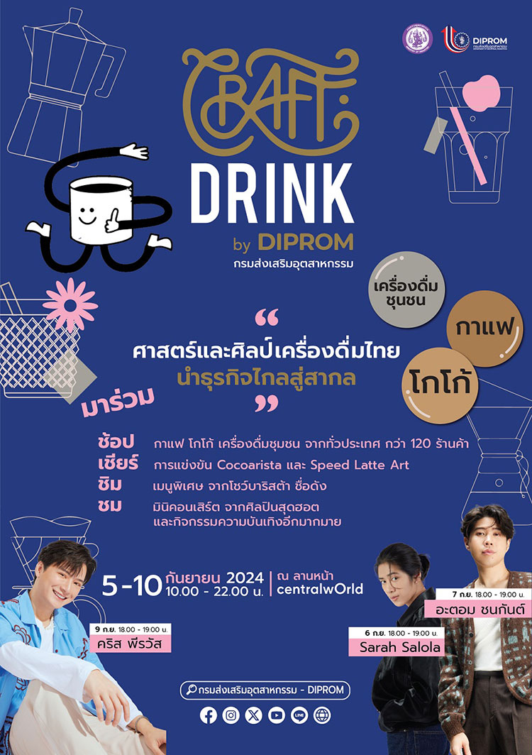 "CRAFT DRINK by DIPROM ศาสตร์และศิลป์เครื่องดื่มไทย นำธุรกิจไกลสู่สากล" ครั้งแรกกับความสนุกที่ห้ามพลาด โอกาสพิเศษที่ทุกคนจะได้ดื่มด่ำกับเครื่องดื่มคราฟท์สุดครีเอทีฟ ที่รวบรวมเครื่องดื่มชุมชน ทั้งโกโก้ กาแฟ และสุราชุมชน จากผู้ประกอบการไทยทั่วทุกภูมิภาค ซึ่งจะพาคุณเดินทางผ่านรสชาติและวัฒนธรรมที่หลากหลาย พร้อมด้วยกิจกรรมมากมายที่น่าตื่นตาตื่นใจที่ให้ทุกคนได้สัมผัสกับประสบการณ์ที่ไม่ซ้ำใคร และมินิคอนเสิร์ตจากหลากหลายศิลปินชั้นนำของไทย ระหว่างวันที่ 5 - 10 กันยายน 2567 เวลา 10.00 – 22.00 น. งานเครื่องดื่มดีๆ..ที่ทุกคนต้องมา ณ ลานหน้าศูนย์การค้าเซ็นทรัลเวิลด์