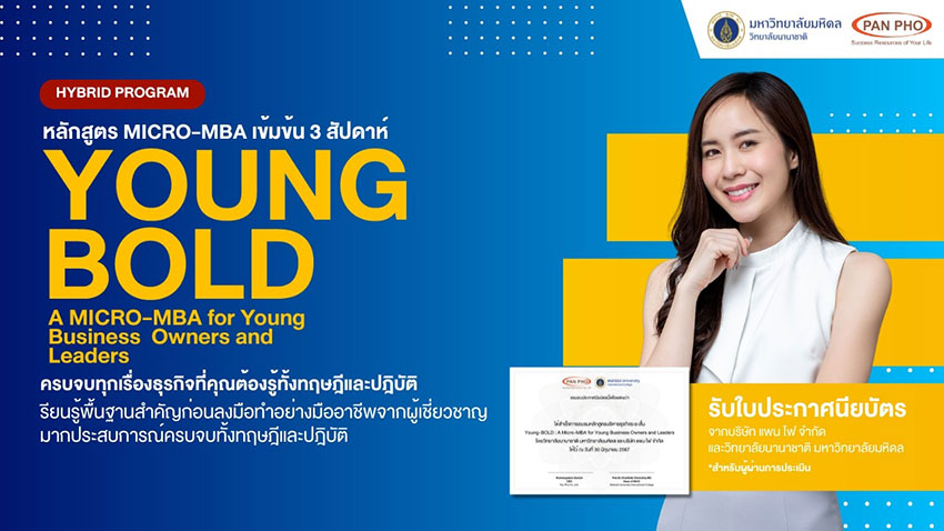 และ หลักสูตรที่ 3: Young-BOLD: MICRO-MBA หลักสูตรที่อัดแน่นด้วยความรู้และทักษะที่เข้มข้นตลอด 3 สัปดาห์ ด้วยการปูพื้นฐานความเข้าใจในการบริหารจัดการธุรกิจเชิงกลยุทธ์ การลงมือทำ ข้อควรระมัดระวัง และกรณีศึกษาต่าง ๆ โดยมีเป้าหมายในการบูรณาการผู้เรียนเพื่อนำไปใช้สร้างผลลัพธ์ทางธุรกิจ ทั้งนี้ผู้เรียนจะได้เข้าใจกระบวนการและขั้นตอนในการทำธุรกิจทั้งในเชิงทฤษฎีและเชิงปฏิบัติการอย่างครบถ้วน หลักสูตร Young-BOLD: MICRO-MBA จึงเหมาะสำหรับผู้ที่ต้องการความรู้และทักษะด้านการบริหารธุรกิจ รวมถึงผู้ที่ไม่มีพื้นฐานด้านการบริหารธุรกิจหรือไม่ได้เรียนด้านบริหารจัดการมา แต่ต้องการทำให้ธุรกิจเติบโตและประสบความสำเร็จ โดยสามารถเข้าดูรายละเอียดหลักสูตรเพิ่มเติมได้ที่ https://panpho.co/MICRO-MBA
