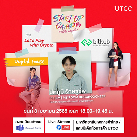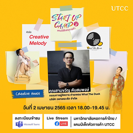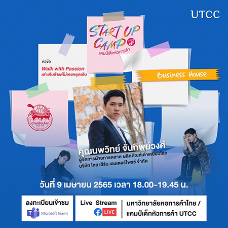 คนรุ่นเล็กแต่ฝันใหญ่ ต้องไม่พลาด ร่วมสัมผัสประสบการณ์และการเรียนรู้ในมิติใหม่สู่การเป็นผู้ประกอบการแห่งโลกอนาคต กับกิจกรรม “START UP CAMP” (สตาร์ทอัพ แคมป์) #แคมป์เด็กหัวการค้า เปิดรับสมัครแล้วตั้งแต่วันนี้ – 22 เมษายน 2565 สอบถามรายละเอียดเพิ่มเติม โทร 02-697-6000 Facebook Page : มหาวิทยาลัยหอการค้าไทย UTCC LINE : @UTCC