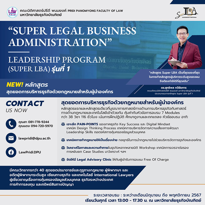 คณะนิติศาสตร์ปรีดี พนมยงค์ มหาวิทยาลัยธุรกิจบัณฑิตย์ (DPU) เปิดอบรมหลักสูตร “สุดยอดการบริหารธุรกิจด้วยกฎหมายสำหรับผู้นำองค์กร” หรือ Super LBA รุ่นที่ 1 ระหว่างมิถุนายน-พฤศจิกายน 2567 “โดยเน้นเปิดนวัตกรรมแห่งการเรียนรู้มิติใหม่ที่บูรณาการศาสตร์ด้านการบริหารธุรกิจกับศาสตร์ด้านกฎหมายและเทคโนโลยีไว้ด้วยกัน ชูจุดเด่นหลักสูตรสร้างผู้นำองค์กรให้เข้าใจและประยุกต์ใช้กฎหมายช่วยเพิ่มประสิทธิภาพการบริหารจัดการธุรกิจให้สามารถยืนหยัดได้ในทุกสถานการณ์โลกทั้งยุค New Normal และ Next Normal”