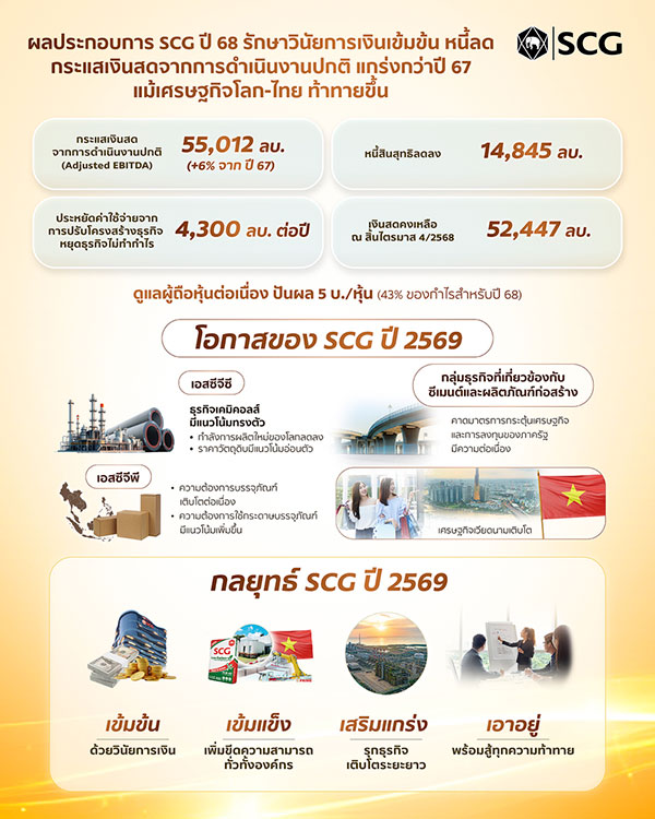 ผลประกอบการเอสซีจีปี 68 รักษาวินัยการเงินเข้มข้น กระแสเงินสดจากการดำเนินงานปกติ ที่ไม่รวมรายการพิเศษ (Adjusted EBITDA) 55,012 ล้านบาท แข็งแกร่งกว่าปี 67 คิดเป็น 6% ขณะที่หนี้ลดลง 14,845 ล้านบาทจากปีก่อน แม้เศรษฐกิจโลกและไทยท้าทายขึ้น ชี้ผลการปรับโครงสร้างธุรกิจ หยุดธุรกิจไม่ทำกำไร และประหยัดค่าใช้จ่าย ได้รวมกว่า 4,300 ล้านบาทต่อปี พร้อมเคาะปันผล 5.0 บาท/หุ้น ดูแลผู้ถือหุ้นต่อเนื่อง ปี 2569 ธุรกิจเคมิคอลส์มีแนวโน้มทรงตัว เนื่องจากกำลังการผลิตใหม่ของโลกลดลง และราคาวัตถุดิบมีแนวโน้มอ่อนตัว เอสซีจีจึงเดินหน้าเข้มข้น ด้วยวินัยการเงิน – เข้มแข็ง เพิ่มขีดความสามารถทั่วองค์กร – เสริมแกร่ง รุกธุรกิจเติบโตระยะยาว มุ่งกลยุทธ์ Regional Optimization ชูเวียดนาม เป็นฐานผลิตรับตลาดในประเทศและส่งออกตลาดโลก พร้อมดันสินค้า SVP - HVA และ Green ที่แนวโน้มเติบโตสูง – เอาอยู่ พร้อมสู้ทุกความท้าทาย