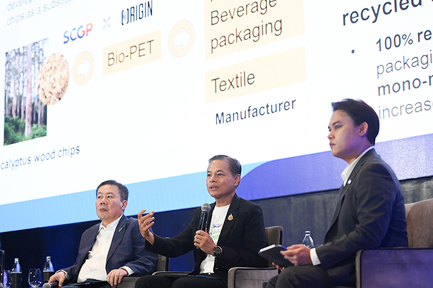 ขณะที่นายวิชาญ จิตร์ภักดี ประธานเจ้าหน้าที่บริหาร บริษัทเอสซีจี แพคเกจจิ้ง จำกัด (มหาชน) กล่าวว่า บรรจุภัณฑ์บนโลกกว่าร้อยละ 80 ทำจากพลาสติกหรือกระดาษ โดยบริษัทฯ เริ่มต้นจากการผลิตกระดาษและบรรจุภัณฑ์กระดาษ และต่อมาได้มีการเพิ่มบรรจุภัณฑ์พลาสติก เพื่อตอบสนองความต้องการของลูกค้าได้ครบวงจรมากขึ้น โดยในช่วง 4-5 ปีที่ผ่านมา กระแส ESG เริ่มมากขึ้นทั้งในส่วนพฤติกรรมผู้บริโภค กฎหมายและข้อบังคับด้านสิ่งแวดล้อมที่มีความเข้มข้นขึ้น บริษัทได้ยึดหลัก “ESG 4 Plus: มุ่ง Net Zero, Go Green, Lean เหลื่อมล้ำ, ย้ำร่วมมือ Plus การดำเนินธุรกิจด้วยความโปร่งใส” โดยให้ความสำคัญกับการเปลี่ยนผ่านการใช้พลังงานเป็นพลังงานหมุนเวียน การใช้เทคโนโลยีมาปรับปรุงประสิทธิภาพในกระบวนการผลิต การลงทุนวิจัยและพัฒนานวัตกรรมโดยใช้เงิน 0.5% ของรายได้จากการขาย ซึ่งผลที่ได้คือ บรรจุภัณฑ์ที่มีนวัตกรรมลดการปล่อยก๊าซเรือนกระจก สามารถนำไปรีไซเคิลได้ง่ายขึ้น นอกจากนี้ยังใช้วัสดุที่ย่อยสลายได้ ลดผลกระทบต่อสิ่งแวดล้อม ตอบโจทย์ความต้องการของผู้บริโภคและการดำเนินการด้าน ESG ของบริษัท พร้อมทั้งแนะนำผู้ประกอบการที่ต้องการลงทุนเพื่อเปลี่ยนผ่านสู่ธุรกิจสีเขียว ให้เริ่มต้นจากสิ่งเล็ก ๆ ก่อน เช่น การแยกขยะหรือการประหยัดพลังงาน หรือหากต้องการลงทุนในเทคโนโลยีที่สูงขึ้นแล้วลงทุนเพียงบริษัทเดียวไม่คุ้มค่า สามารถแชร์การลงทุนร่วมกับพาร์ทเนอร์ได้ เพื่อให้ธุรกิจสามารถเปลี่ยนผ่านและไปต่อได้