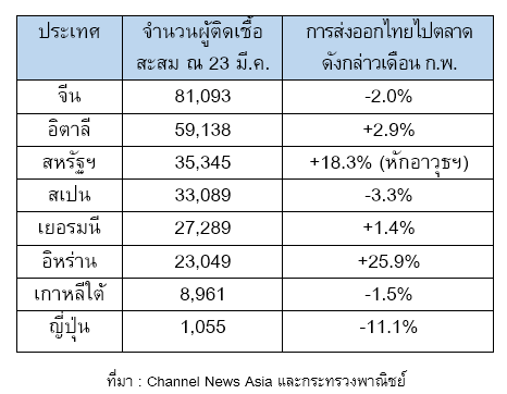 ล่าสุดเมื่อวันที่ 23 มีนาคม 2563 กระทรวงพาณิชย์ได้ประกาศตัวเลขการส่งออกเดือนกุมภาพันธ์ 2563 ออกมาหดตัว 4.5% ดีกว่าที่หลายฝ่ายคาด โดยนอกจากจะได้อานิสงส์จากการส่งออกทองคำที่ขยายตัวถึง 180% แล้ว มีข้อสังเกตว่าตลาดส่งออกสำคัญของไทยที่มีจำนวนผู้ติดเชื้อและผู้เสียชีวิตจาก COVID-19 ในสัดส่วนสูงทั้งจีน EU สหรัฐฯ ตะวันออกกลาง เกาหลีใต้ และญี่ปุ่น ซึ่งมีสัดส่วนรวมกันคิดเป็นเกือบ 50% ของมูลค่าส่งออกรวมของไทยหดตัวน้อยกว่าที่คาด โดยมีประเด็นที่น่าสนใจ ดังนี้