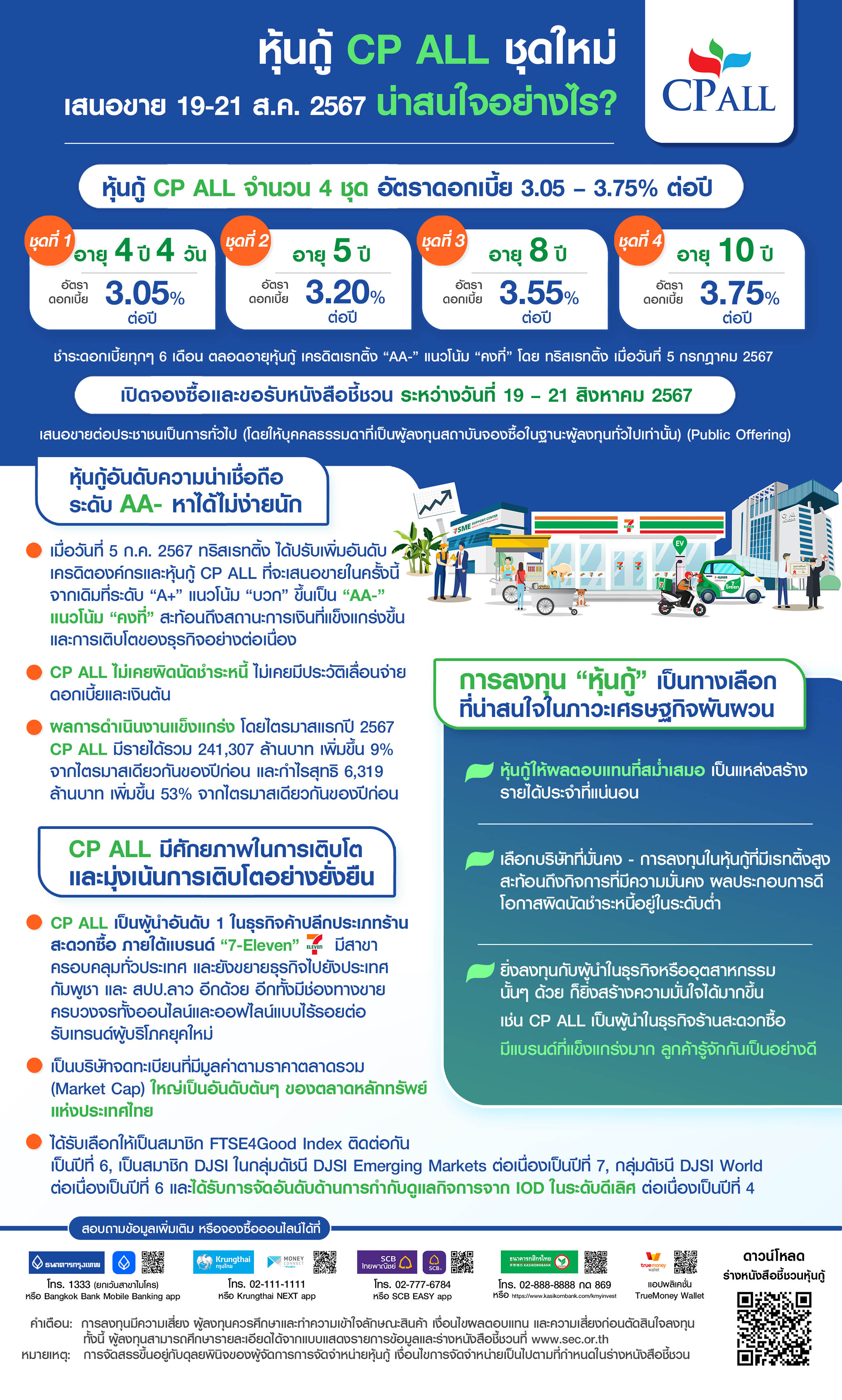 ซีพี ออลล์” ผู้บริหารร้านเซเว่น อีเลฟเว่น เซเว่น เดลิเวอรี่ และผู้ถือหุ้นใหญ่ บริษัท ซีพี แอ็กซ์ตร้า จำกัด (มหาชน) เตรียมออกหุ้นกู้เสนอขายแก่ประชาชนเป็นการทั่วไป จำนวน 4 ชุด อายุหุ้นกู้ตั้งแต่ 4 ปี 4 วัน ถึง 10 ปี อัตราดอกเบี้ยคงที่ระหว่าง 3.05 – 3.75% ต่อปี โดยหุ้นกู้ที่เสนอขายครั้งนี้ได้รับการปรับเพิ่มอันดับความน่าเชื่อถืออยู่ที่ระดับ “AA-” แนวโน้ม “คงที่” (Stable) จากทริสเรทติ้ง สะท้อนถึงสถานะทางการเงินที่แข็งแกร่งขึ้นของบริษัท ทั้งจากระดับกำไรที่ปรับตัวดีขึ้นและอัตราส่วนหนี้สินทางการเงินที่ลดลง เตรียมเปิดให้จองซื้อระหว่างวันที่ 19 - 21 สิงหาคม 2567 ผ่านสถาบันการเงินชั้นนำ 4 แห่ง รวมถึงขายผ่านแอปพลิเคชั่น TrueMoney Wallet พร้อมเตือนนักลงทุนให้ระมัดระวังมิจฉาชีพหลอกลงทุน