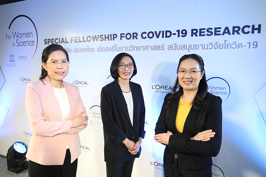 นักวิจัยสตรีทั้ง 3 ท่านที่ได้รับทุนพิเศษเพื่องานวิจัยโควิด-19 จากโครงการทุนวิจัย ลอรีอัล ประเทศไทย “เพื่อสตรีในงานวิทยาศาสตร์” ในสาขาวิทยาศาสตร์ชีวภาพ คือ รศ.พญ. อรุณี ธิติธัญญานนท์ จากภาควิชาจุลชีววิทยา คณะวิทยาศาสตร์ มหาวิทยาลัยมหิดล กับงานวิจัยหัวข้อ โครงการวิจัยเพื่อพัฒนาวิธีการวินิจฉัย วิธีการรักษาโรค วัคซีนของโรค COVID-19 และการติดตามการเปลี่ยนแปลงลักษณะทางพันธุกรรมและระบาดวิทยา ที่เกิดจากเชื้อไวรัส SARS-CoV-2 ด้านสาขาวัสดุศาสตร์ คือ ดร.นฤภร มนต์มธุรพจน์ จากศูนย์วิจัยเทคโนโลยีสิ่งอำนวยความสะดวกและเครื่องมือแพทย์ สำนักงานพัฒนาวิทยาศาสตร์และเทคโนโลยีแห่งชาติ กับงานวิจัยหัวข้อ การเตรียมและทดสอบคุณสมบัติของวัสดุคอมพอสิทของไฮดรอกซีอะพาไทต์และไททาเนียมไดออกไซด์สำหรับใช้เป็นแผ่นกรองจุลินทรีย์ และ สาขาเทคโนโลยี คือ ดร. อนันต์ลดา โชติมงคล จากศูนย์วิจัยเทคโนโลยีสิ่งอำนวยความสะดวกและเครื่องมือแพทย์ สำนักงานพัฒนาวิทยาศาสตร์และเทคโนโลยีแห่งชาติ กับงานวิจัยหัวข้อ ระบบติดตามและประเมินผู้ที่มีความเสี่ยงต่อโรคติดเชื้อ COVID-19 (DDC-Care)