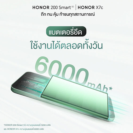ออเนอร์ (HONOR) ผู้ให้บริการอุปกรณ์อัจฉริยะชั้นนำระดับโลก สร้างนิยามใหม่แห่งความคุ้มค่าและความทนทาน ด้วยการเปิดตัว HONOR X7c และ HONOR 200 Smart 5G อย่างเป็นทางการในประเทศไทย ชูจุดเด่นด้วยแบตเตอรี่ขนาดใหญ่ ความจุสูง 6000mAh และ 5200mAh รองรับการใช้งานได้ยาวนานตลอดวัน ตัวเครื่องแข็งแกร่งทนต่อการตกจากความสูง 1.5 เมตร พร้อมมาตรฐาน IP64 ป้องกันฝุ่นและน้ำ โดยสมาร์ตโฟนทั้งสองรุ่นมากับหน่วยความจำภายในแบบจัดเต็มขนาด 8+256GB และกล้อง AI คมชัดสูงสุด ช่วยเก็บทุกรายละเอียดในทุกภาพถ่าย ไม่ว่าจะใช้งานในชีวิตประจำวันหรือเก็บบันทึกช่วงเวลาสำคัญ โดย HONOR X7c เปิดตัวด้วยราคาเพียง 5,999 บาท และ HONOR 200 Smart 5G ราคา 6,999 บาท วางจำหน่ายแล้ววันนี้ พร้อมโปรโมชันพิเศษ Early Bird 28 พฤศจิกายน 2567 - 19 มกราคม 2568 รับฟรี HONOR Band 9 มูลค่า 1,699 บาท รีบจับจองสมาร์ตโฟนที่ให้มากกว่าความคุ้มค่าก่อนใคร และเปลี่ยนทุกวันของคุณให้ง่ายและสนุกยิ่งขึ้นกับ HONOR