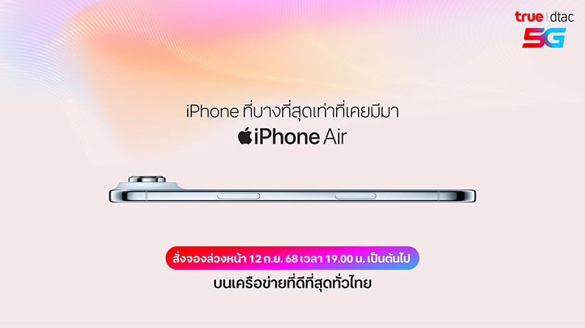 ทรู ดีแทค 5G เตรียมวางจำหน่าย iPhone 17, iPhone Air, iPhone 17 Pro, iPhone 17 Pro Max โดยลูกค้าสามารถสั่งจอง iPhone รุ่นใหม่ทั้งหมดได้ตั้งแต่วันศุกร์ที่ 12 กันยายน 2568เวลา 19.00 น. และจะพร้อมจำหน่ายในวันศุกร์ที่ 19 กันยายน 2568 โปรดตรวจสอบรายละเอียดวันวางจำหน่ายของ Apple Watch Series 11, Apple Watch SE 3, Apple Watch Ultra 3 และ AirPods Pro 3 อีกครั้ง ติดตามรายละเอียดราคา และการวางจำหน่ายเพิ่มเติมได้ที่ https://www.true.th/promotion/devices/iphone-17-pro