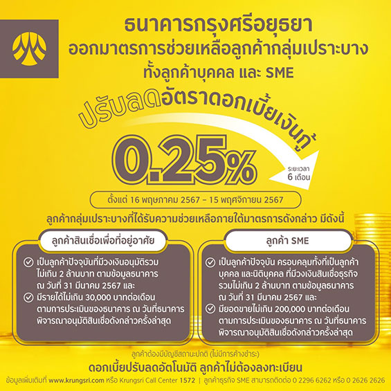 กรุงศรี (ธนาคารกรุงศรีอยุธยา จำกัด (มหาชน)) ตอบรับแนวทางการช่วยเหลือเพิ่มเติมสำหรับลูกค้ากลุ่มเปราะบางของทางสมาคมธนาคารไทย ด้วยการออกมาตรการปรับลดอัตราดอกเบี้ยเงินกู้ 0.25% สำหรับลูกค้ากลุ่มเปราะบาง ทั้งลูกค้าบุคคล และผู้ประกอบการ SME เป็นเวลา 6 เดือน มีผลตั้งแต่วันที่ 16 พฤษภาคม 2567 – 15 พฤศจิกายน 2567